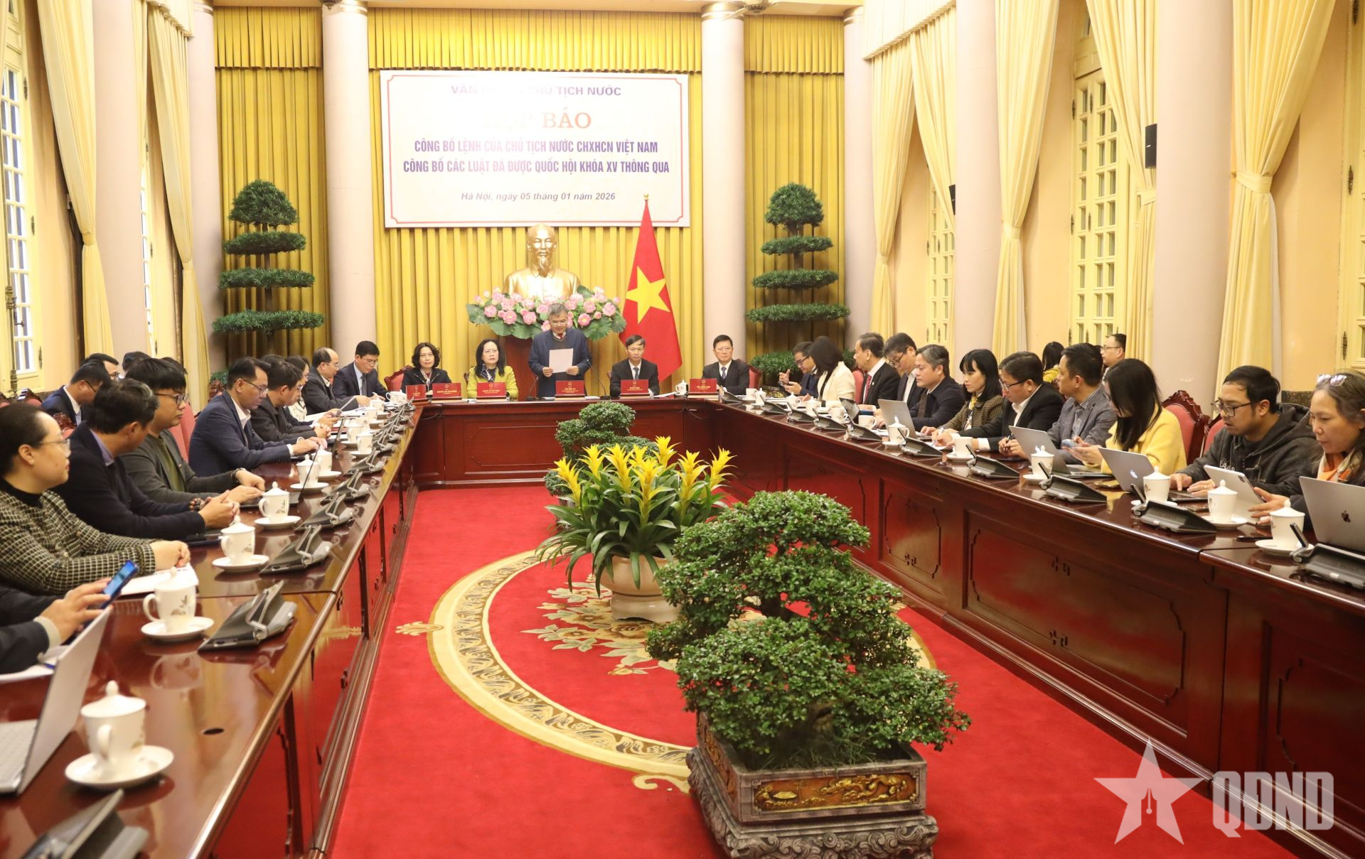 Tại họp báo, đồng chí Cấn Đình Tài, Phó chủ nhiệm Văn phòng Chủ tịch nước, Trợ lý Chủ tịch nước đã công bố Lệnh của Chủ tịch nước công bố: Luật Tương trợ tư pháp về dân sự; Luật Giám định tư pháp; Luật Thi hành án dân sự; Luật Dân số; Luật Phòng bệnh; Luật sửa đổi, bổ sung một số điều của Luật Chuyển giao công nghệ; Luật Trí tuệ nhân tạo; Luật sửa đổi, bổ sung một số điều của Luật Sở hữu trí tuệ; Luật Công nghệ cao; Luật Chuyển đổi số; Luật Xây dựng; Luật Hàng không dân dụng Việt Nam; Luật sửa đổi, bổ sung một số điều của Luật Quy hoạch đô thị và nông thôn.