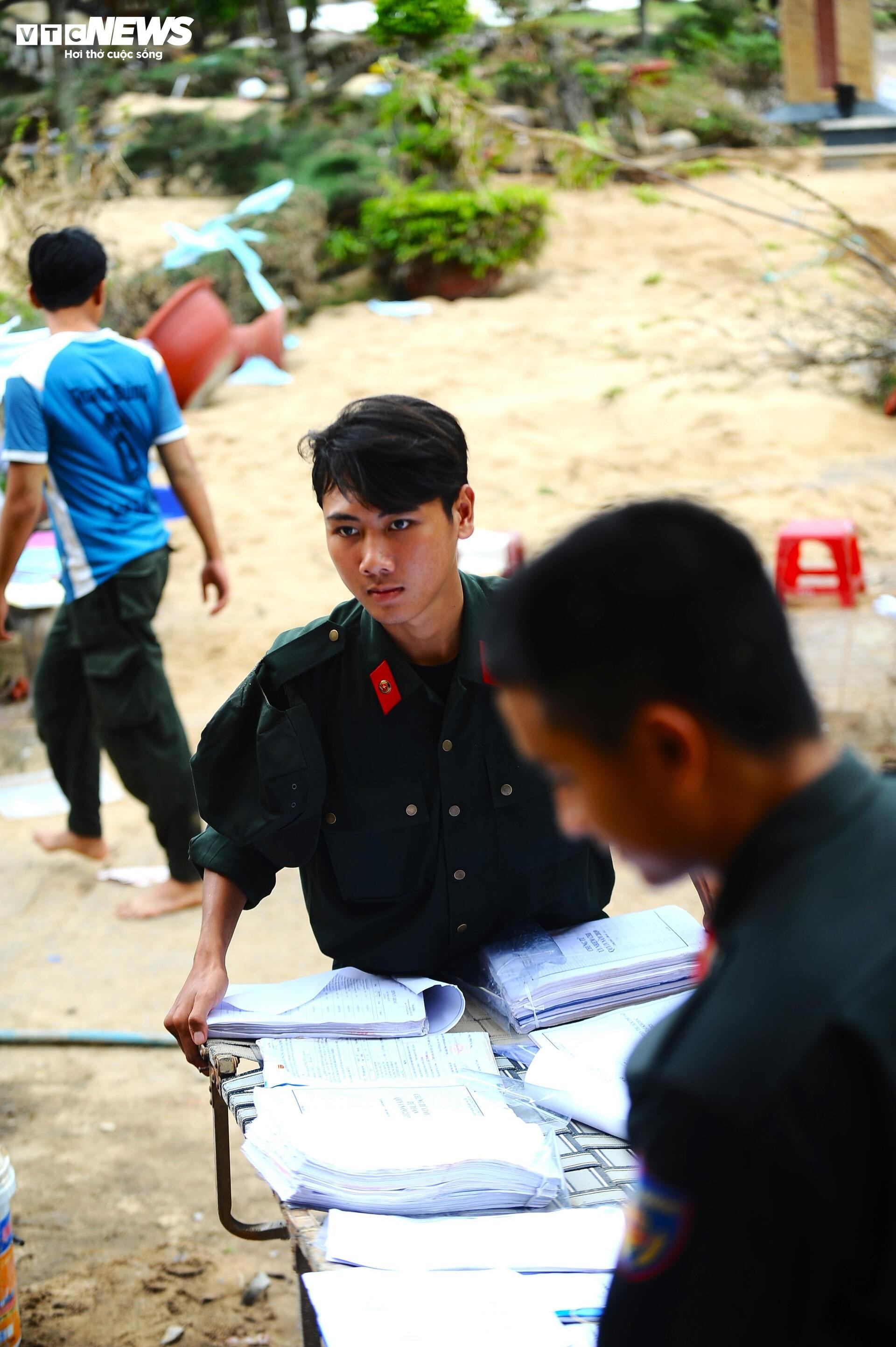 Ở một địa điểm khác, các chiến sĩ công an đang phơi khô sổ sách, tài liệu chuẩn bị cho việc dạy học trở lại.