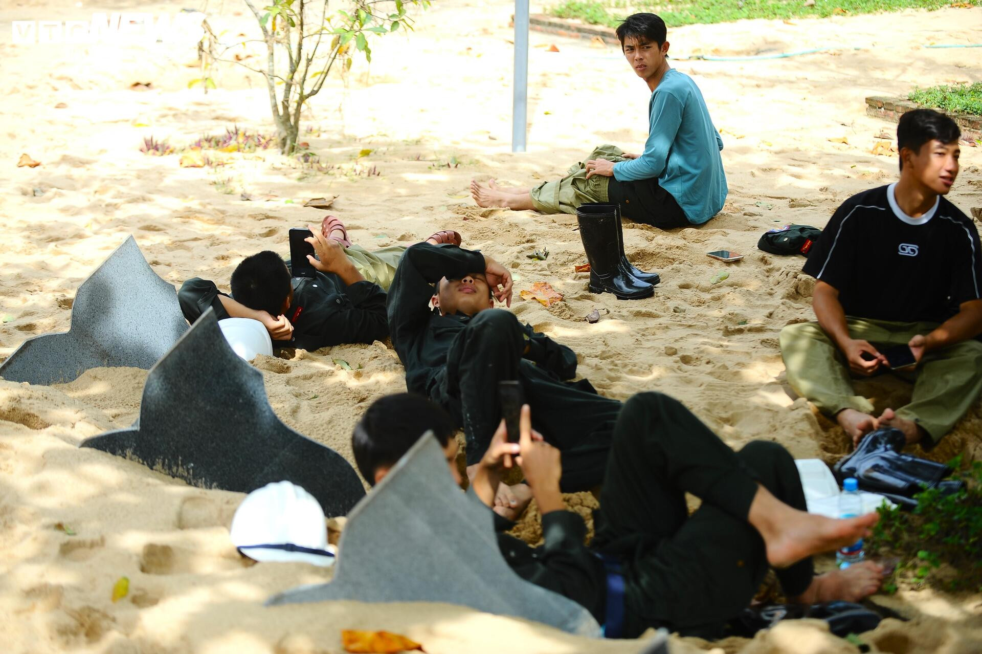Giây phút nghỉ ngơi vội vã trên nền cát của các chiến sĩ trẻ sau nhiều ngày căng mình hỗ trợ người dân.