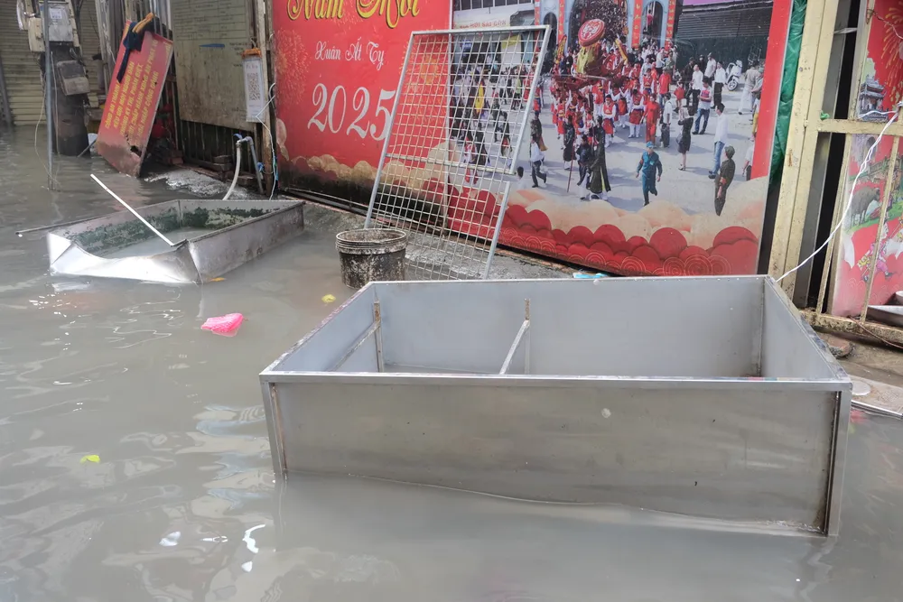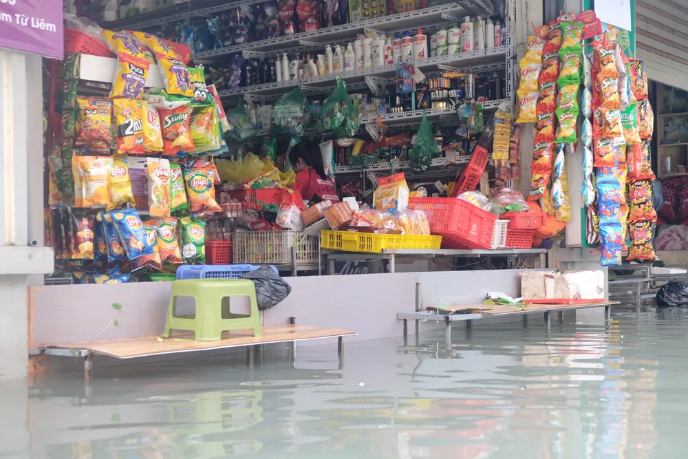 Trên khắp cung đường, không khí nồng nặc mùi ẩm mốc, nước bẩn. Những bó rau, túi rác, mảnh xốp, bỉm trẻ em theo dòng nước trôi lềnh bềnh. Còn dưới lớp nước, sỏi đá, thanh gỗ, gối bông quấn lấy chân. Người dân nhịn thở, di chuyển bằng cách lội bộ, nhích từng bước, bì bõm giữa khu chợ quen thuộc.