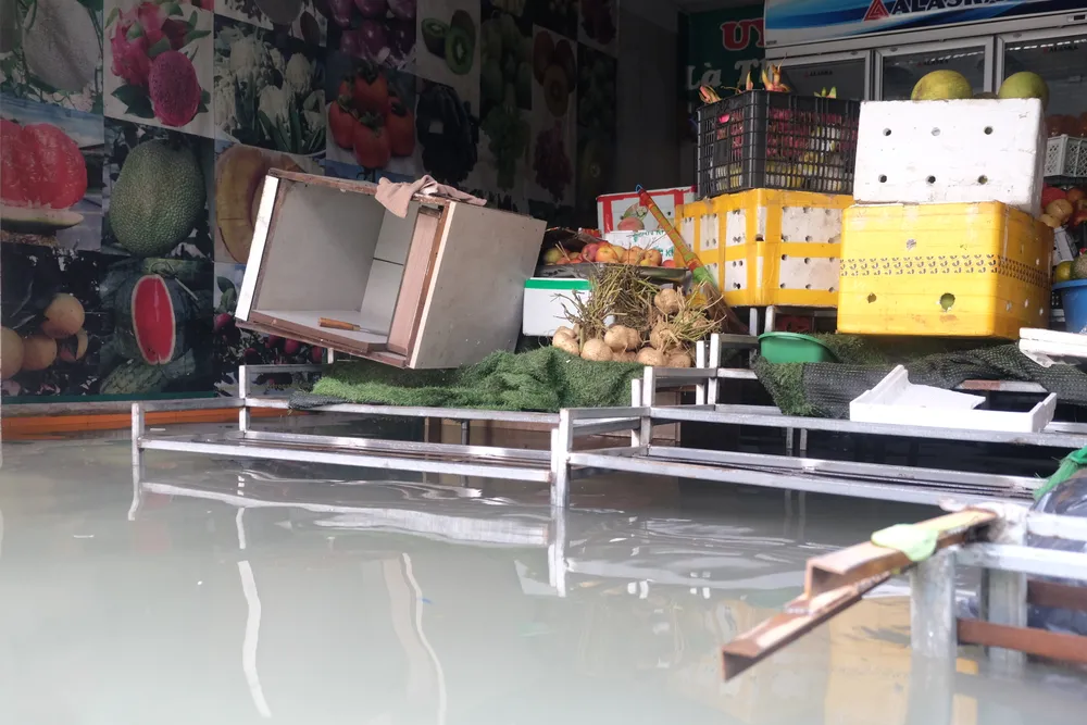 Các sạp hàng bị nước vây kín. Thùng xốp, bàn gỗ kê lên cao, rau củ, trái cây chất chồng trên kệ, phần lớn đều hỏng vì ngấm nước. Ông Trịnh Văn Hùng, một tiểu thương, bưng thùng xốp nổi lềnh bềnh ra ngoài, lắc đầu: “Rau quả, đồ ăn hỏng gần hết, kê cao thế rồi mà vẫn dính".