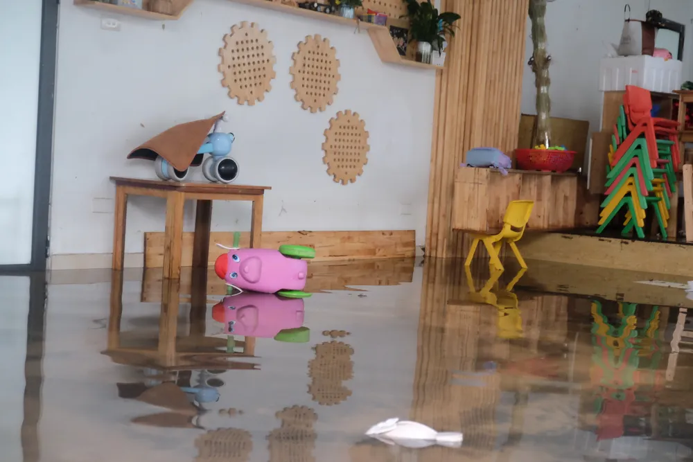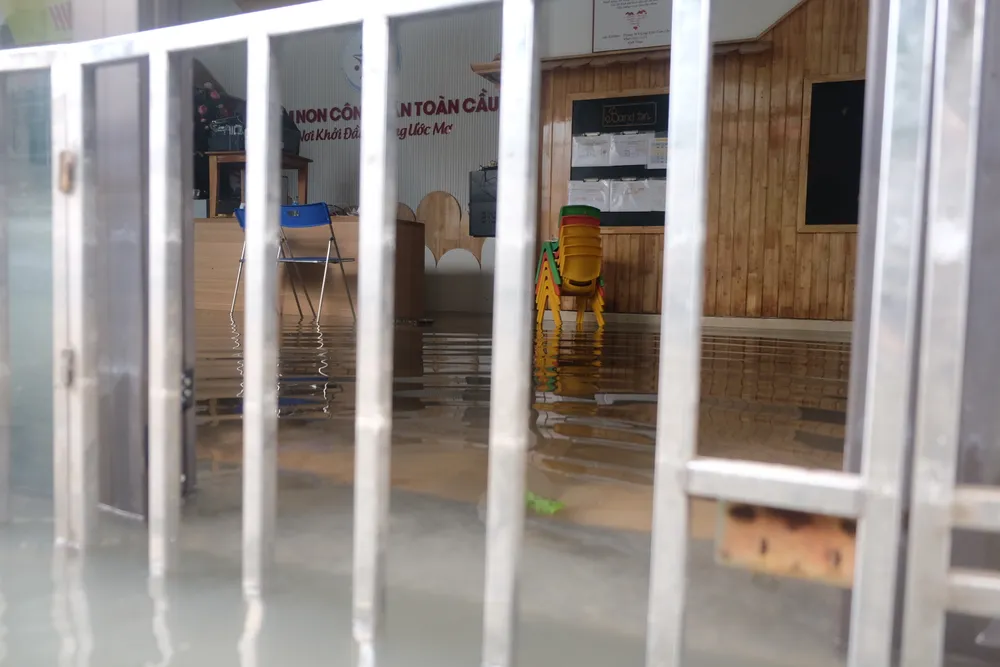 Rút kinh nghiệm từ đợt ngập sau bão số 10, lần này ngôi trường mầm non và nhiều gia đình ở làng Phú Đô đã kê đồ đạc cao hơn. Ảnh: TT
