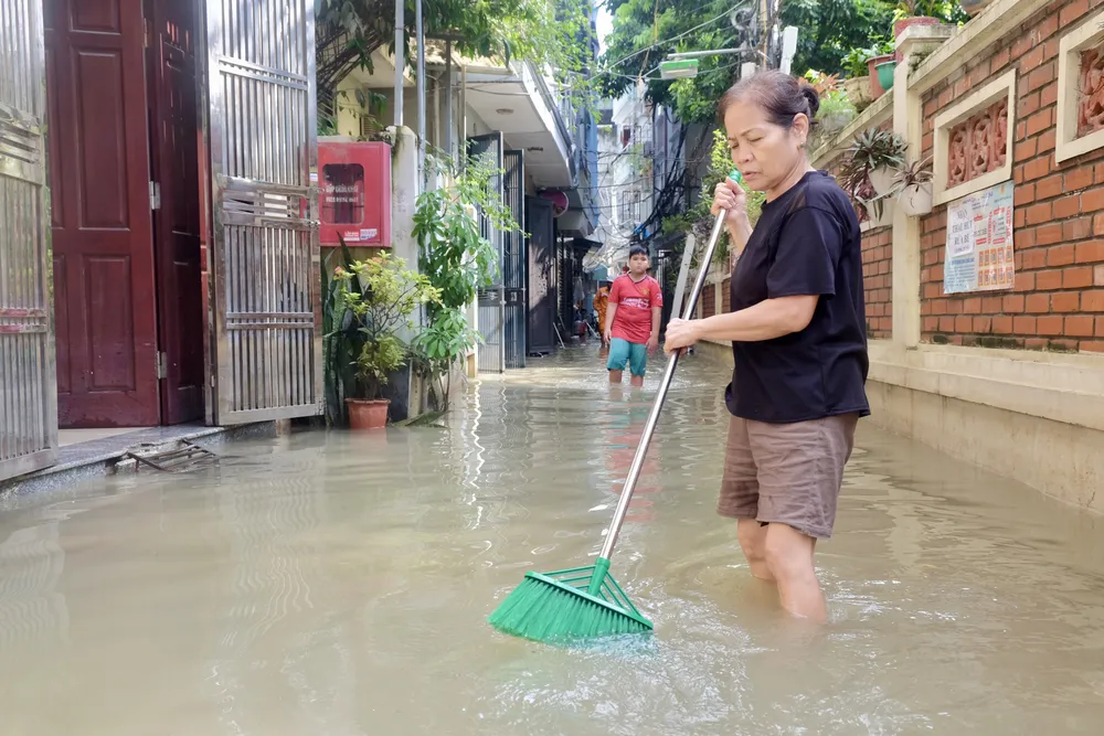 Người phụ nữ đứng giữa ngõ, trước cửa nhà, tay cầm cây chổi đẩy từng đợt nước để cuốn rác ra xa. Bên cạnh, đứa con gái nhỏ trong bộ váy hồng cũng gắng sức làm theo. Nước đã dâng qua ba bậc cửa, tràn vào nhà, cuốn theo rác thải và mùi ẩm nồng.