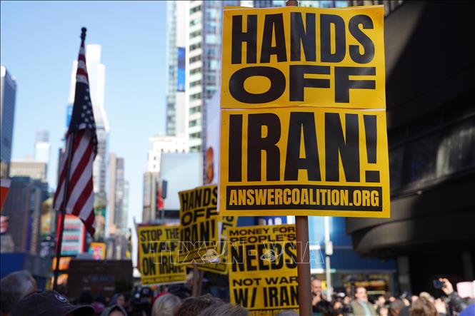 Tuần hành phản đối chiến dịch tấn công Iran của lực lượng Mỹ và Israel tại New York, Mỹ ngày 28/2/2026. Ảnh: THX/TTXVN
