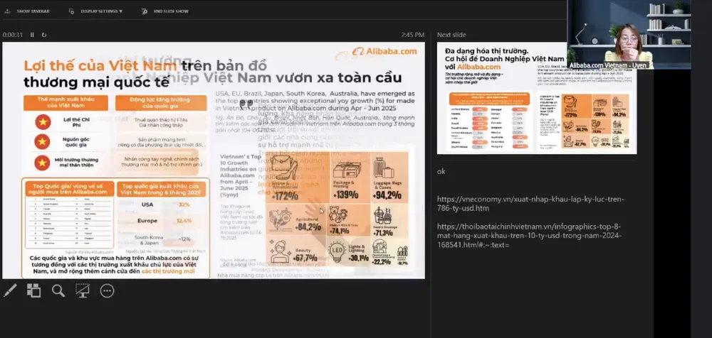 Chia sẻ về cơ hội cho doanh nghiệp Việt Nam, bà Nguyễn Thị Phương Uyên, đại diện Alibaba.com Việt Nam cho biết, thời gian qua từ tháng 4-8 có nhiều thông tin (chính sách thuế quan-pv) khiến cho các doanh nghiệp cảm thấy khó khăn, tuy nhiên tình hình xuất khẩu của Việt Nam vẫn ổn định và dự kiến tăng trưởng trong quý III.
