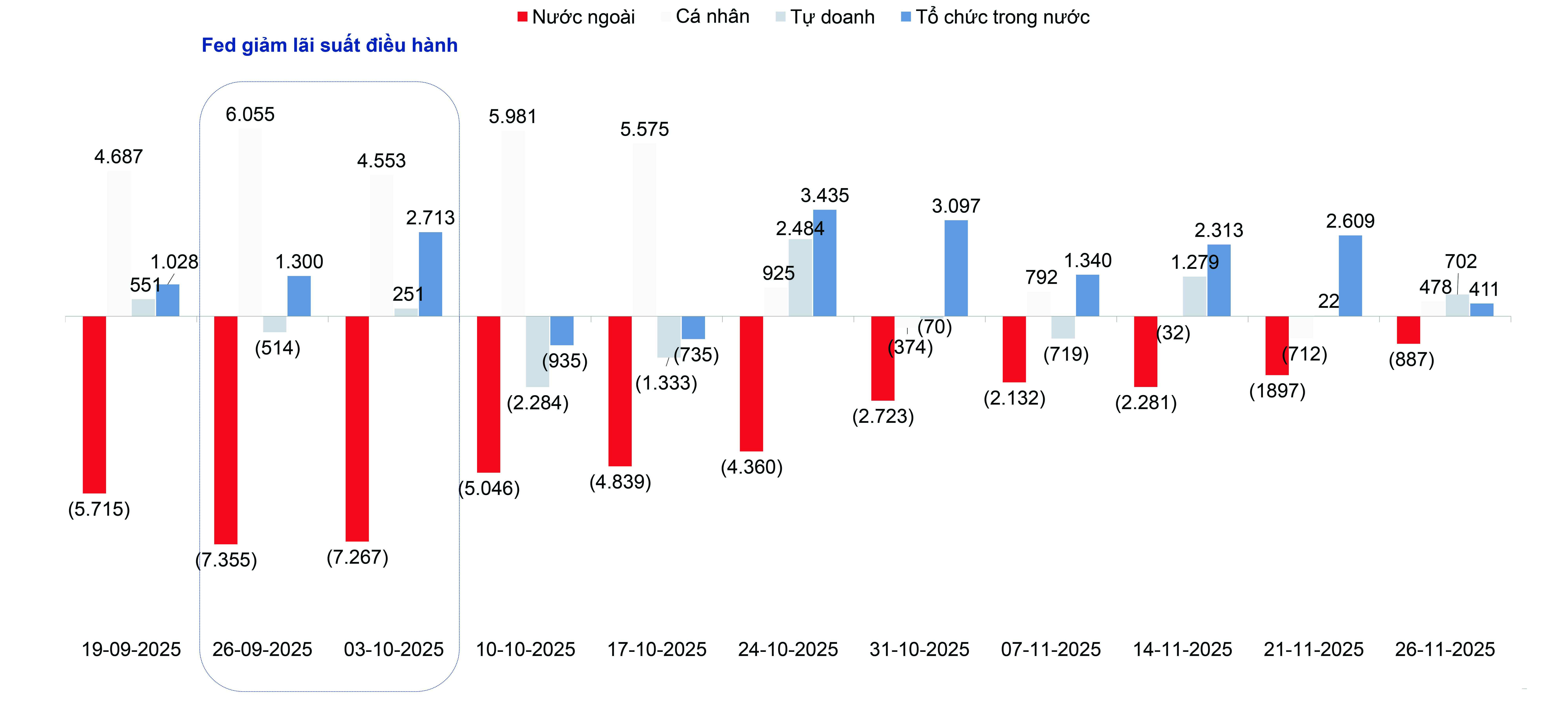 Từ sau cuộc họp cuối tháng 10, khi Cục Dự trữ Liên bang Mỹ (Fed) tiếp tục chu kỳ giảm lãi suất, áp lực bán ròng đã hạ nhiệt rõ rệt. Thị trường hiện kỳ vọng Fed sẽ giảm thêm 25 điểm cơ bản trong cuộc họp tháng 12 với xác suất trên 80%, sau chuỗi dữ liệu cho thấy thị trường lao động Mỹ yếu đi.