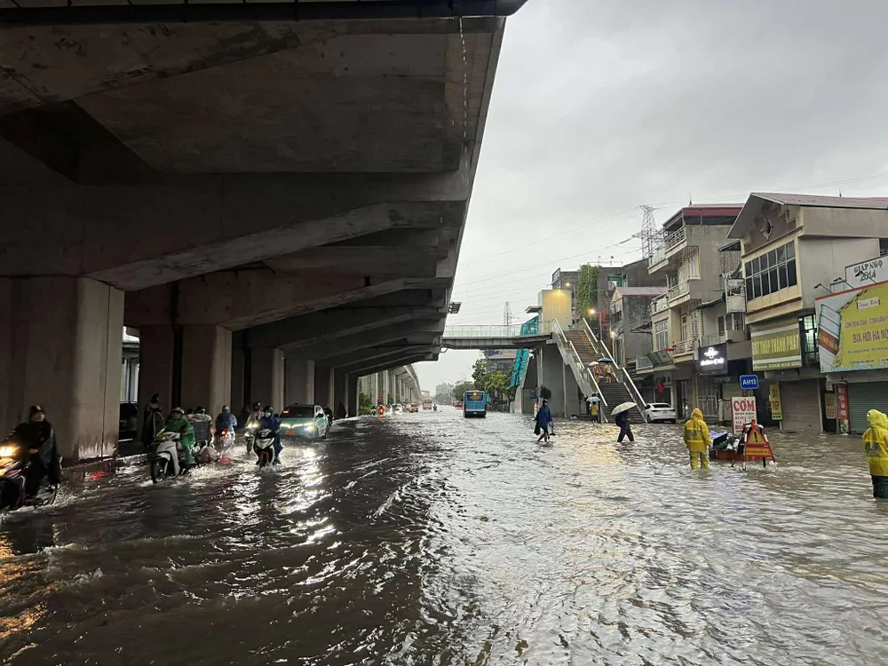Khu vực đoạn qua Aeon Mall Long Biên ngập nặng. Đến khoảng 7 giờ, tình trạng ngập đã được cải thiện, các phương tiện có thể di chuyển được.