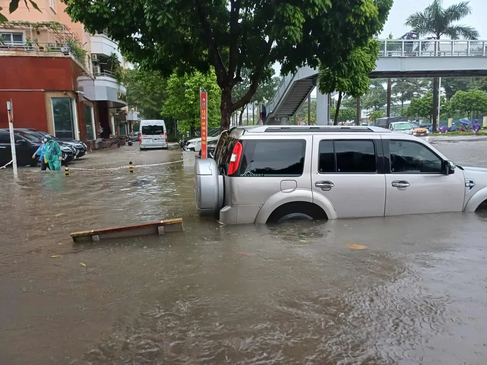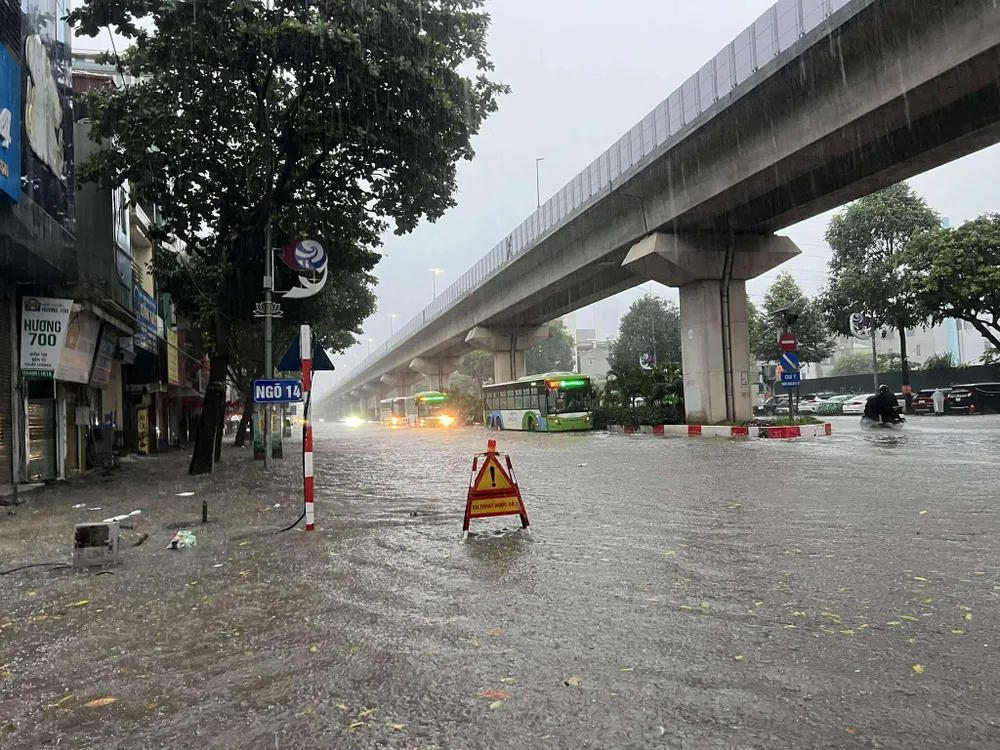 Cũng tại khu vực này, các lực lượng chức năng đã có mặt để phân luồng phương tiện, tiêu thoát nước, đặt cảnh báo ở các điểm ngập sâu.