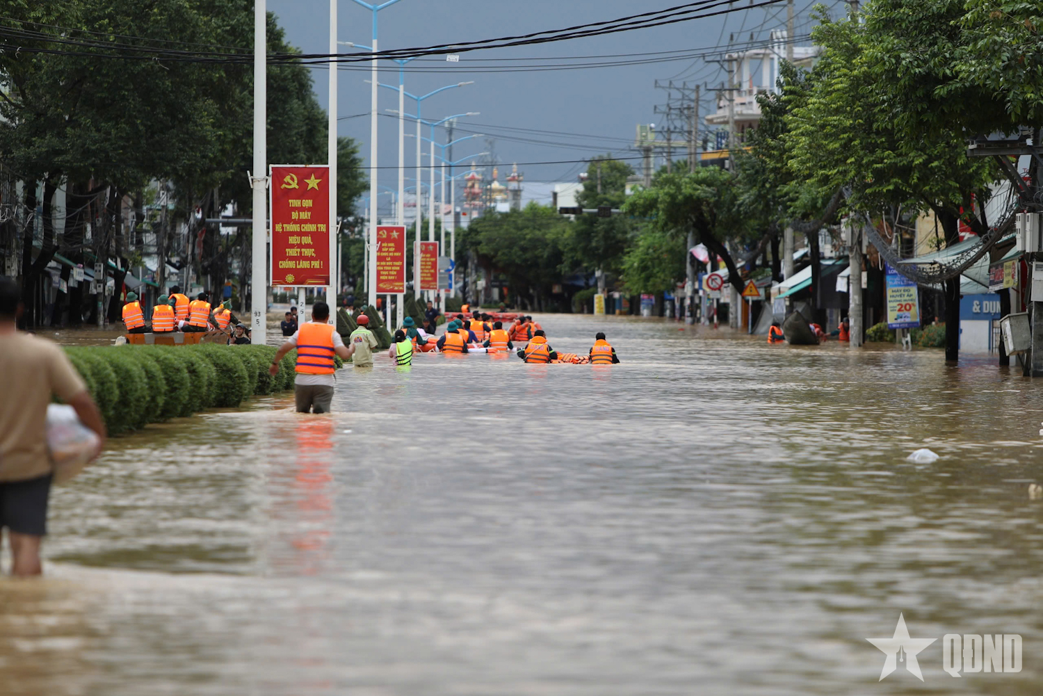 Nước ngập sâu hơn nửa mét, có đoạn trên 1m, nhiều xe không thể chạy, người dân phải lội bộ trên đường 23 Tháng 10 (phường Tây Nha Trang). Các cửa hàng đều đã đóng cửa. Các lực lượng được huy động nhiều hướng phân luồng bảo đảm an toàn.