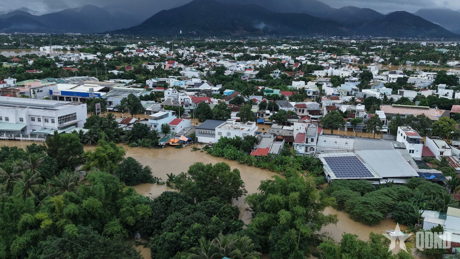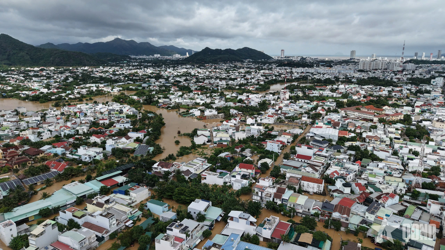 Toàn cảnh từ trên cao khu vực bị nước lũ bủa vây ở phường Tây Nha Trang.