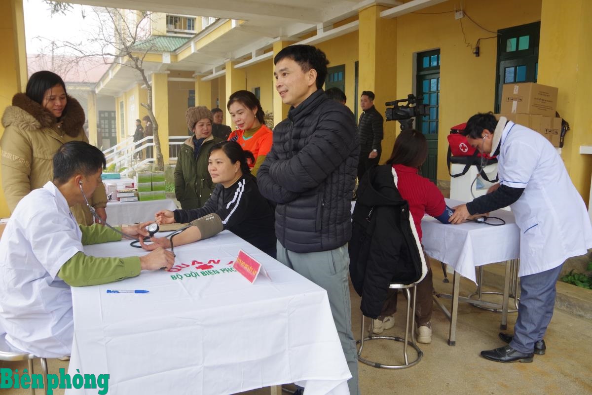 Quân y Đồn Biên phòng cửa khẩu Xín Mần và các y, bác sĩ Bệnh viện mắt Trường Phúc khám bệnh cho nhân dân. Ảnh: Xuân Minh