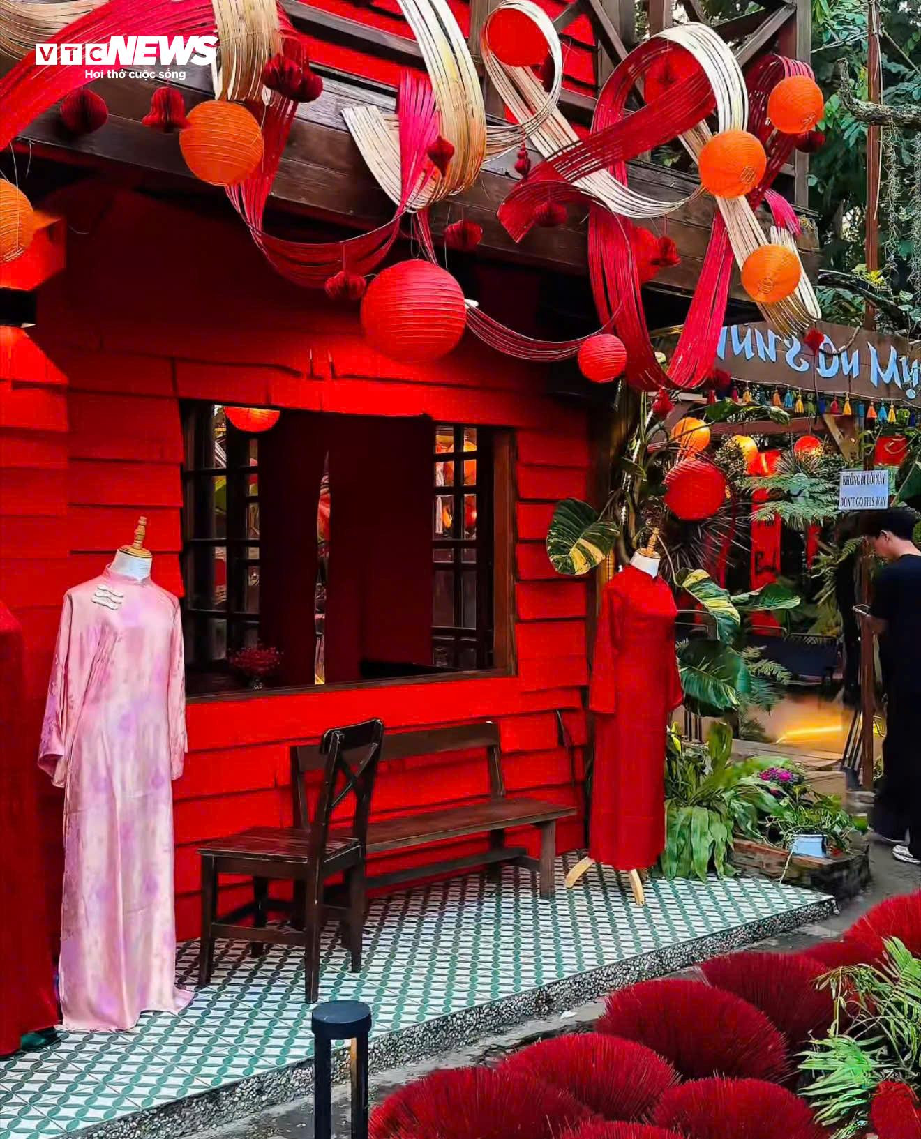 Mai vàng, đào hồng, đèn lồng, câu đối, bàn ghế gỗ, phông nền nhà cổ, thậm chí cả những góc tái hiện sinh hoạt ngày Tết xưa được đầu tư công phu. Không ít quán dành toàn bộ sân, tầng trệt hoặc khu vực ngoài trời để làm bối cảnh chụp ảnh, bố trí ánh sáng, lối đi riêng cho khách.