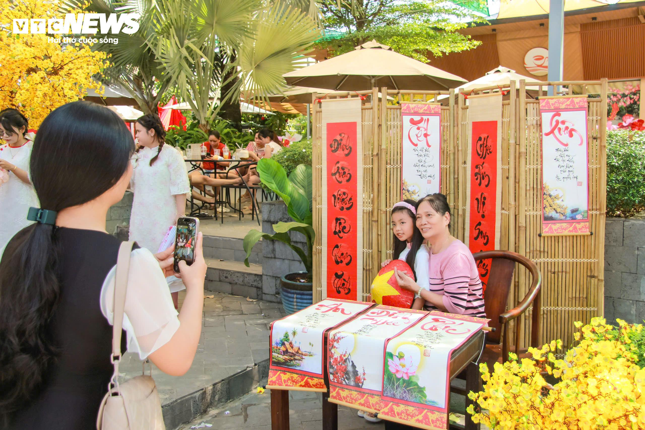 Người dân đến chụp ảnh Tết tại quán cà phê.