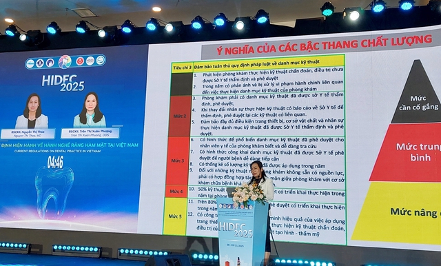 Tại phiên chuyên đề Hội nghị khoa học và Triển lãm Răng Hàm Mặt quốc tế TPHCM lần thứ III - HIDEC 2025 ở TPHCM, hai chuyên gia thuộc Sở Y tế TPHCM, BS.CKII Nguyễn Thị Thoa - Trưởng phòng Nghiệp vụ Y và BS.CKII Trần Thị Xuân Phượng - Quyền Trưởng phòng Kiểm tra – Pháp chế, đã trình bày báo cáo "Cập nhật quy định mới trong hành nghề khám chữa bệnh Răng Hàm Mặt".