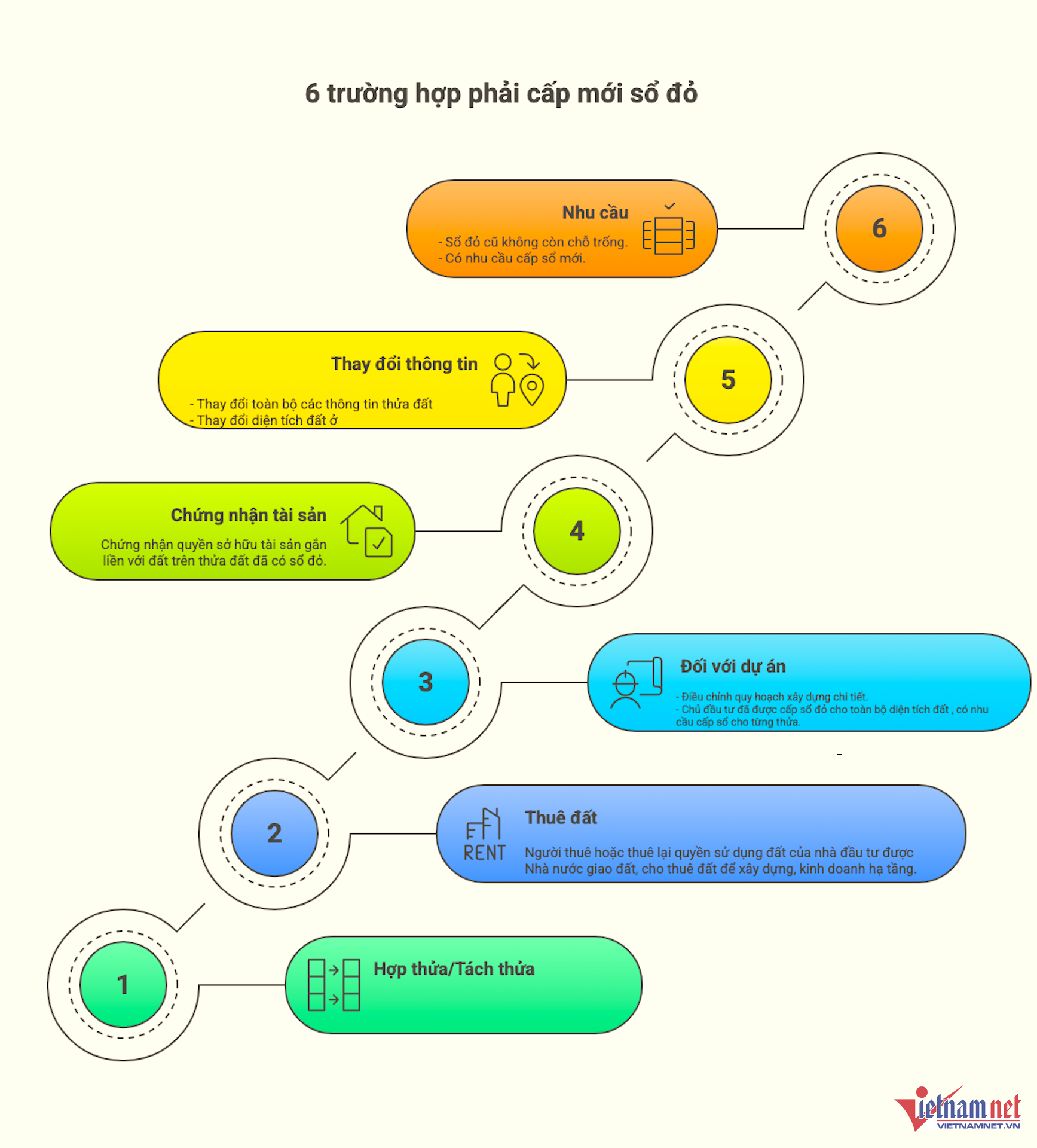 Theo đó, có 6 trường hợp đăng ký biến động đất đai, tài sản gắn liền với đất phải cấp mới sổ đỏ.