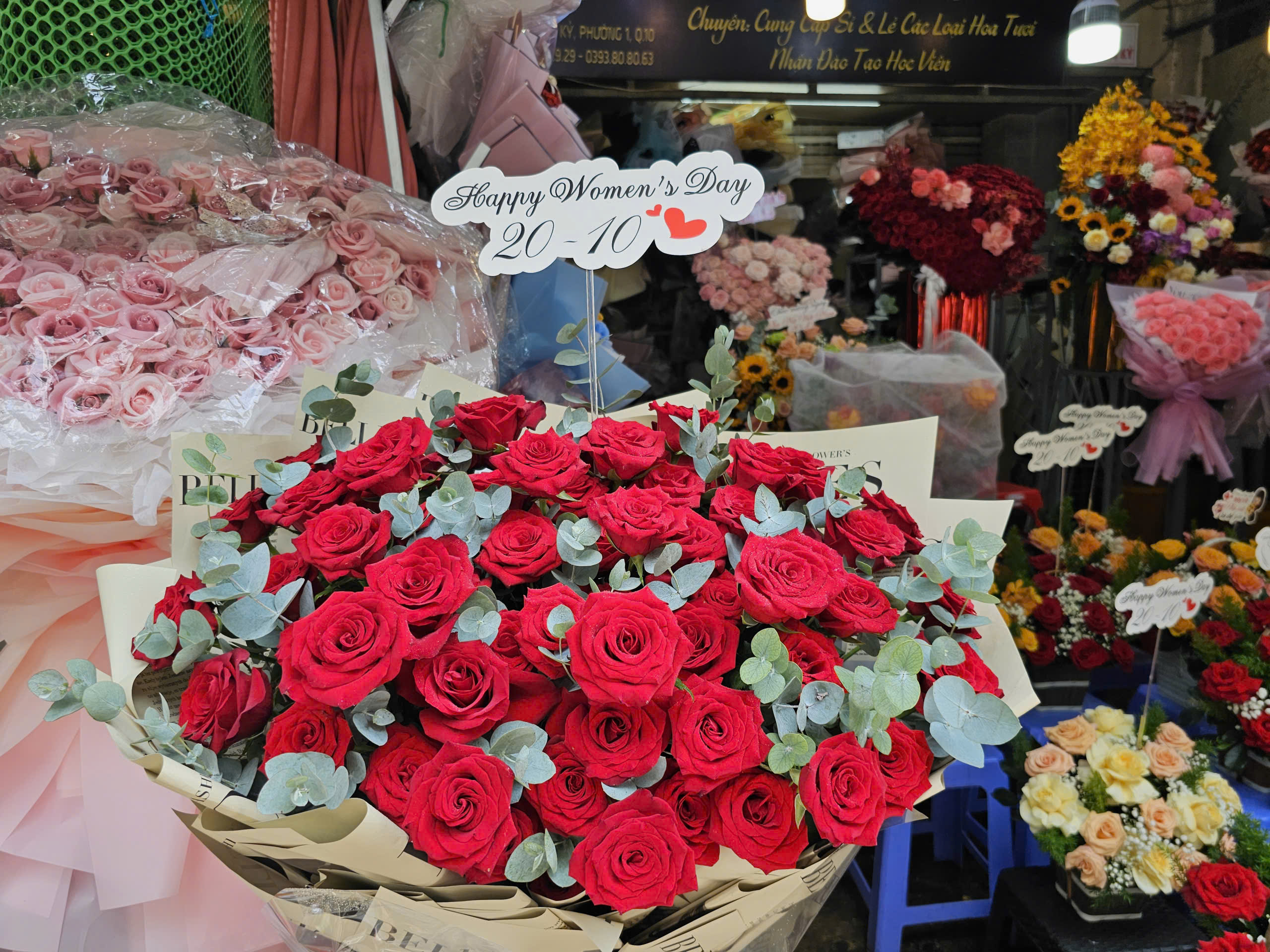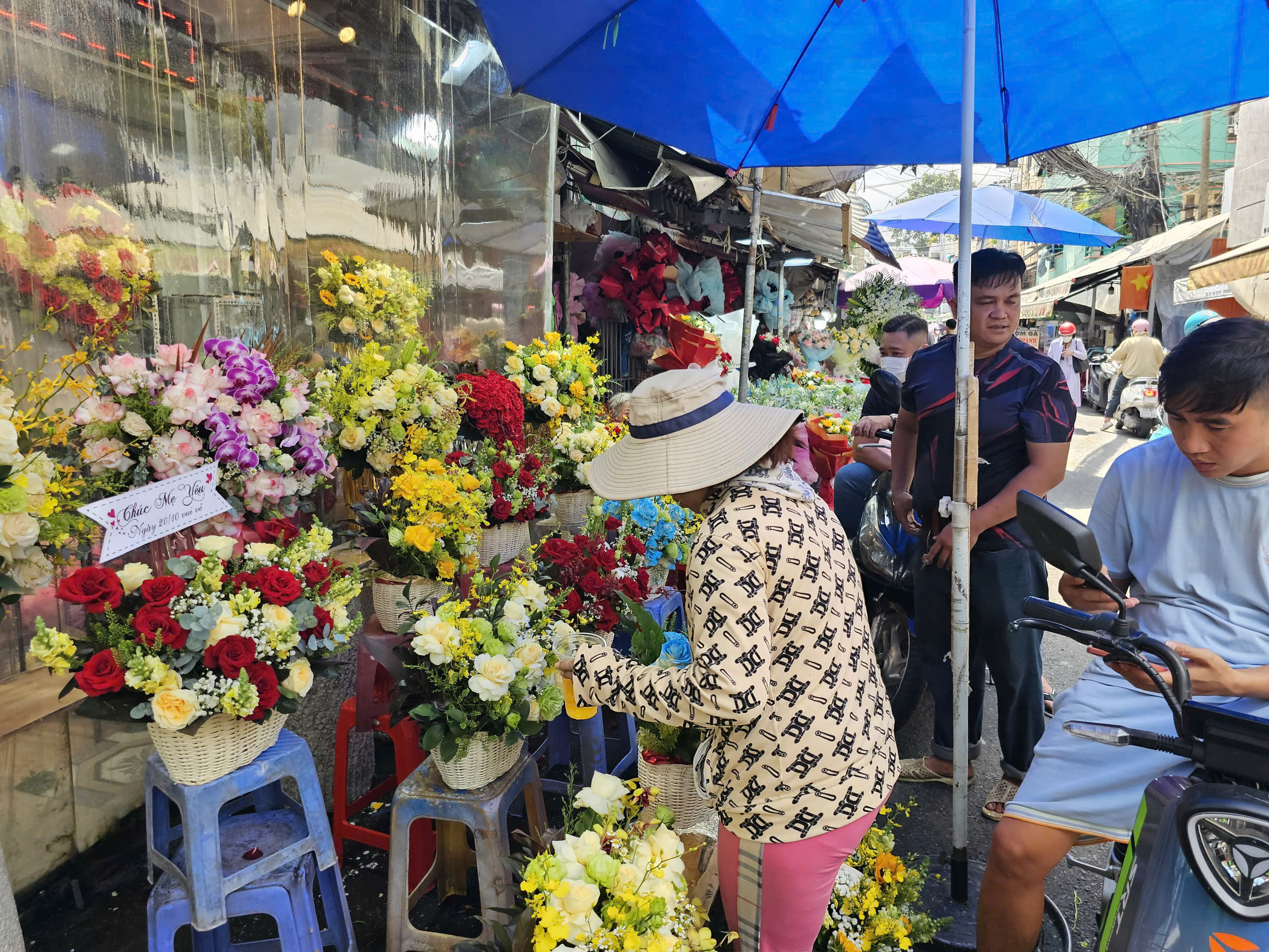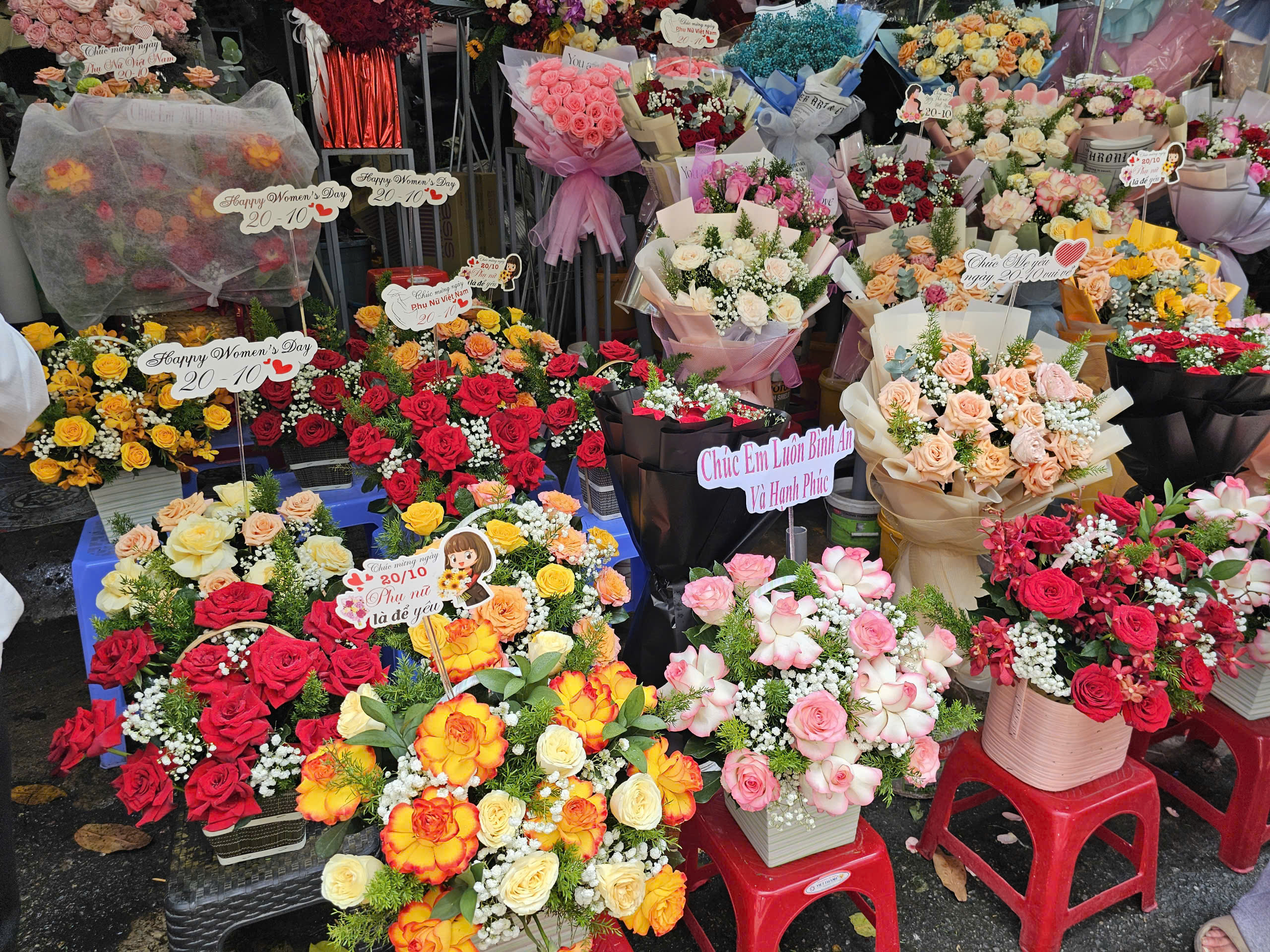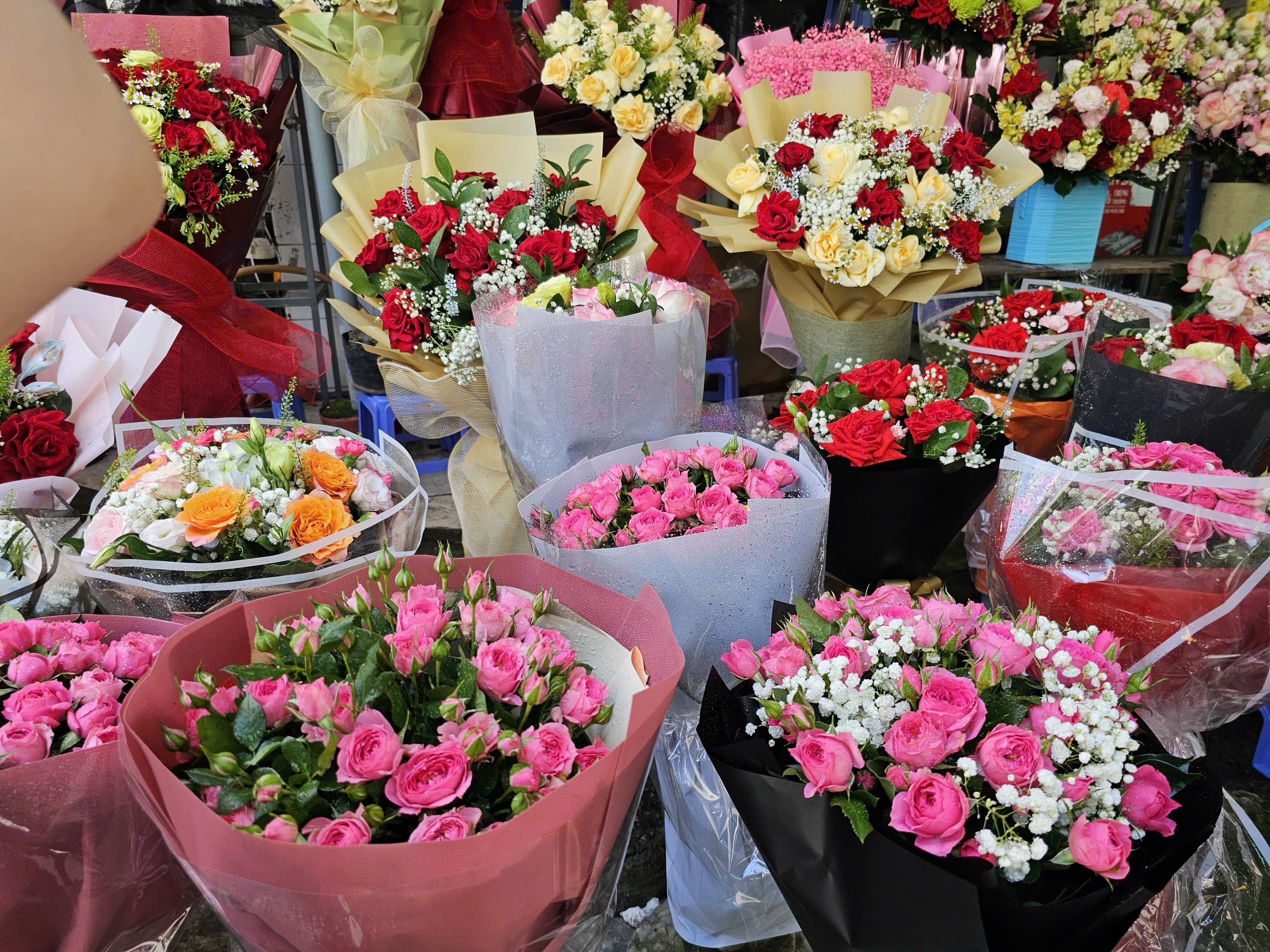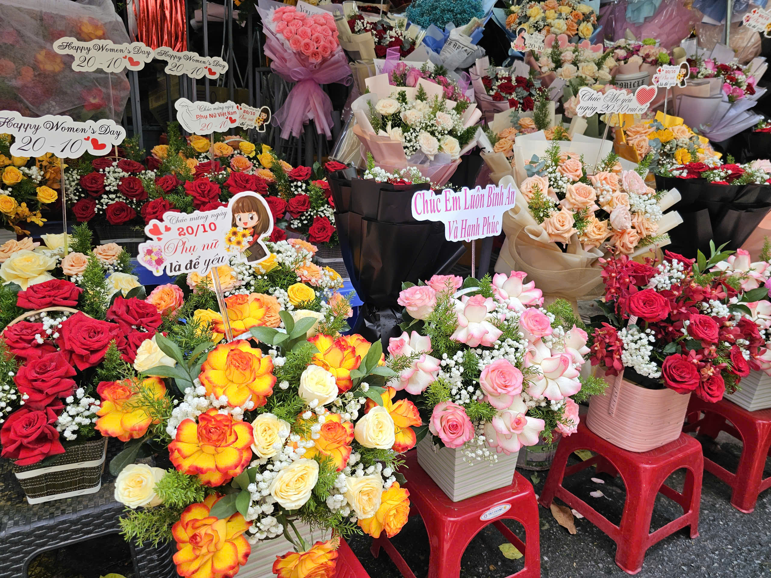 Từ sáng sớm, các tuyến đường quanh chợ đã đông kín người đến mua hoa, nhiều cửa hàng hoạt động hết công suất để kịp giao hàng trong ngày Phụ nữ Việt Nam.