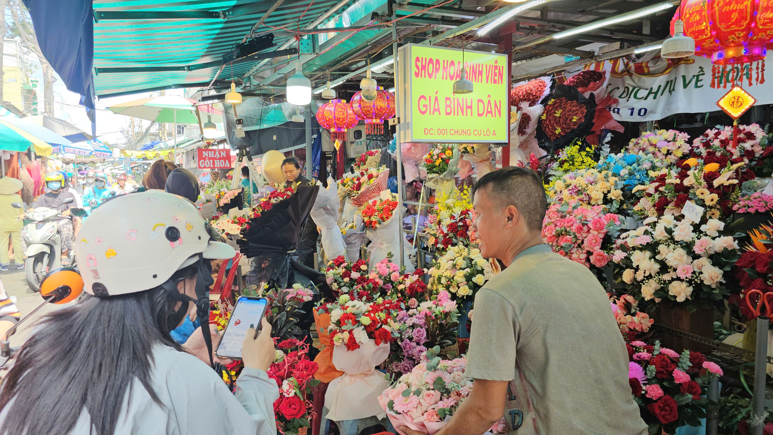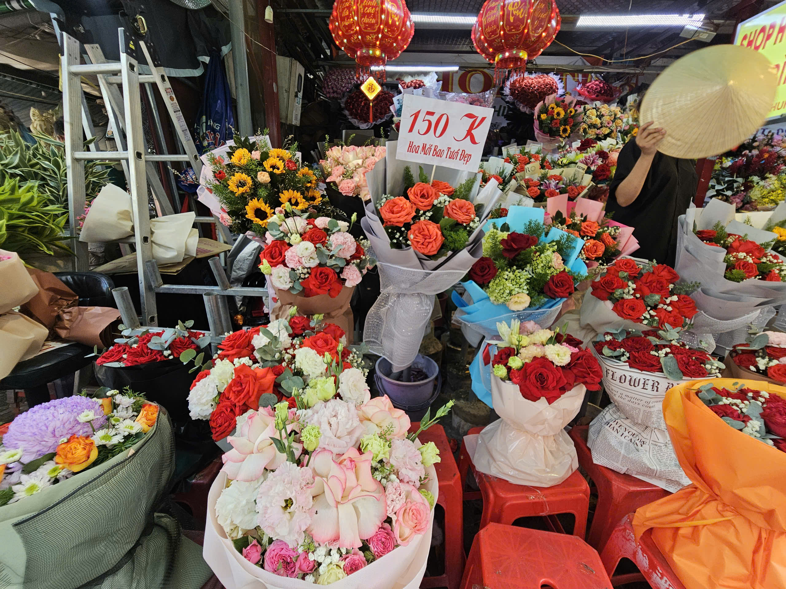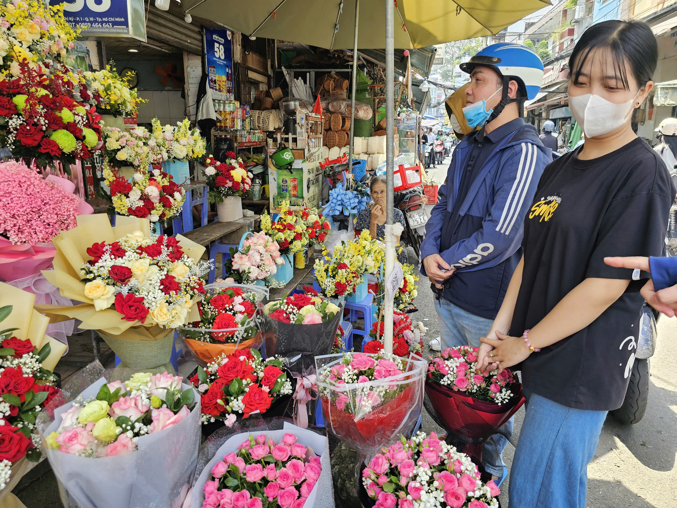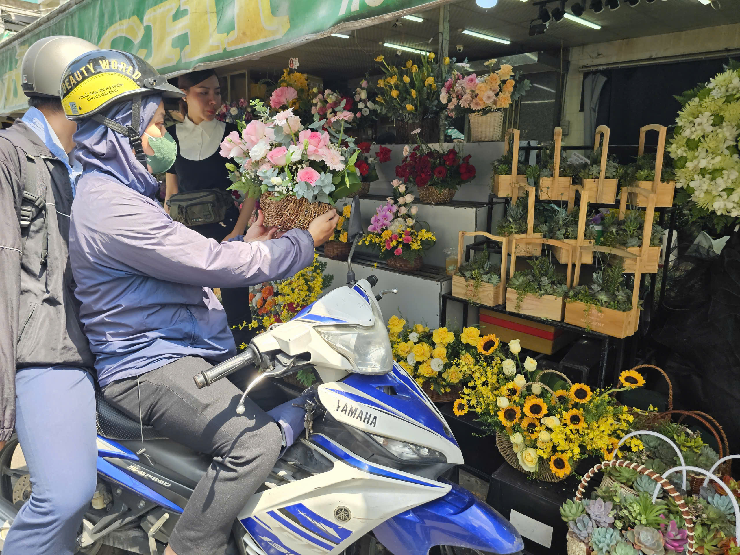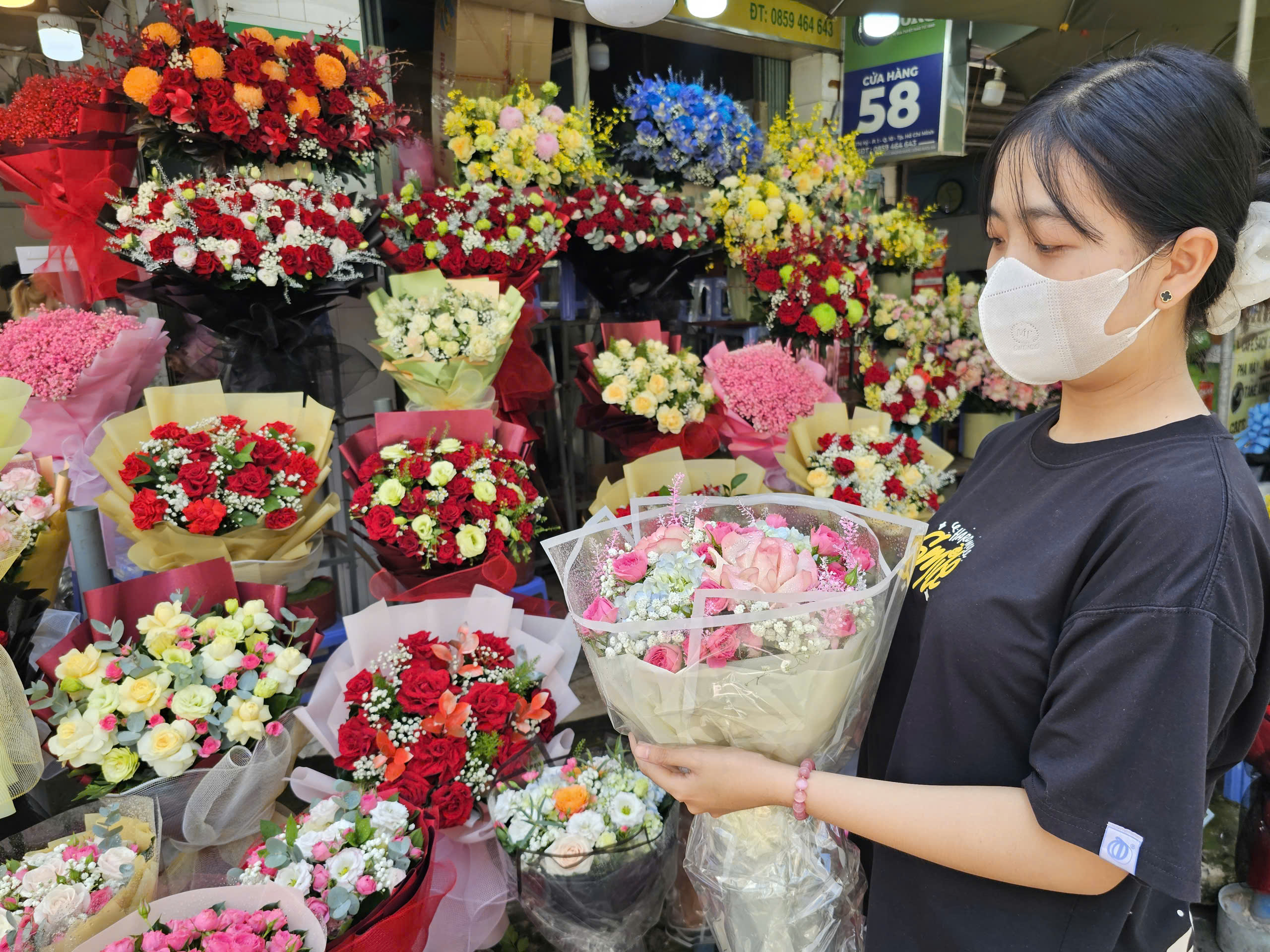 Từ sáng sớm, các tuyến đường quanh chợ đã đông kín người đến mua hoa, nhiều cửa hàng hoạt động hết công suất để kịp giao hàng trong ngày Phụ nữ Việt Nam.
