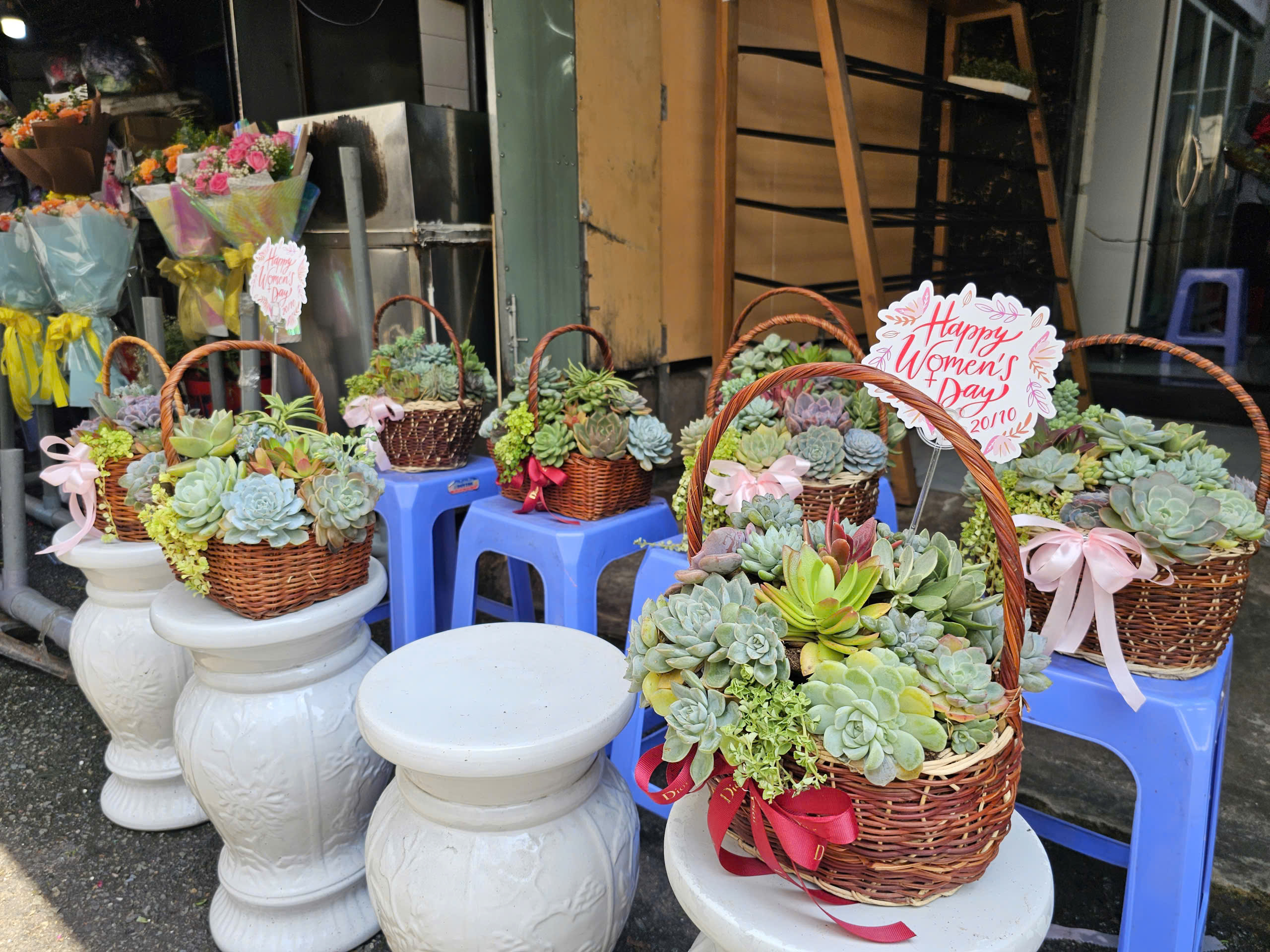 Tại các cửa hàng khác như Kha Nguyễn, Sinh Viên,... nhiều giỏ hoa tươi được cắm sẵn để khách thuận tiện chọn mua.