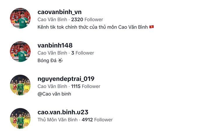 Không chỉ riêng Đình Bắc, thủ môn Cao Văn Bình cũng bị mạo danh với nhiều tài khoản TikTok khác nhau. Một số tài khoản sử dụng hình ảnh thi đấu, tên thật của cầu thủ hay lấy video từ kênh chính chủ về cắt ghép để tạo cảm giác đây là trang cá nhân chính chủ, từ đó thu hút người theo dõi.
