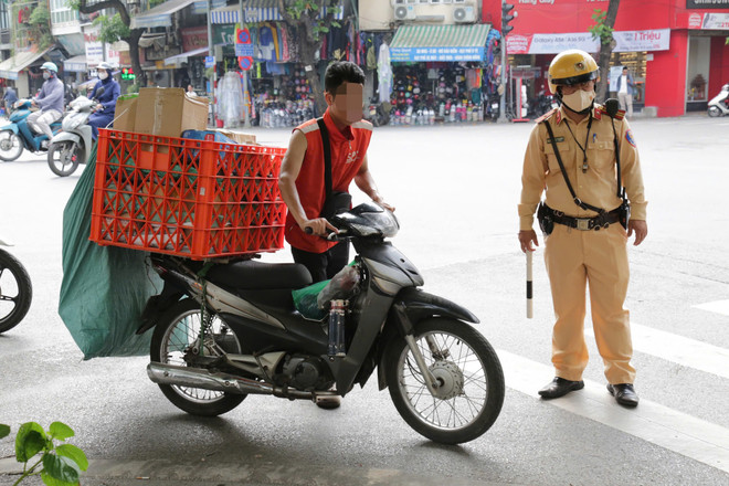 Một tài xế chạy ứng dụng gọi xe giao hàng bị lực lượng cảnh sát giao thông xử lý vi phạm che biển số. (Ảnh: PV/Vietnam+)