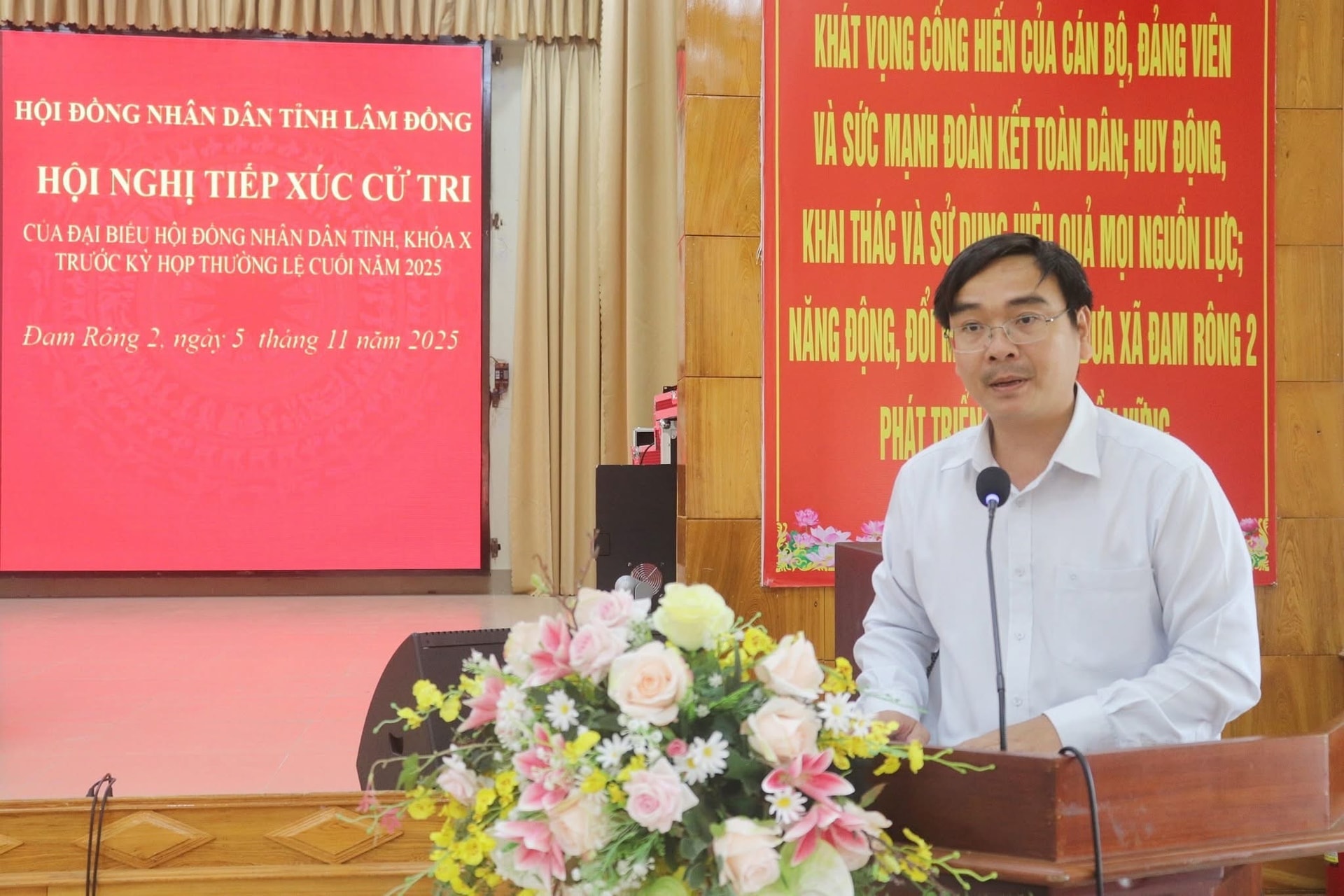 Chiều 5/11, Tổ đại biểu số 14, HĐND tỉnh Lâm Đồng số gồm các đồng chí: K’ Mák, Ủy viên Ban Thường vụ Tỉnh ủy, Phó Chủ tịch HĐND tỉnh; Phạm Thị Tường Vân, Tỉnh ủy viên, Trưởng Ban Kinh tế - Ngân sách HĐND tỉnh; Đa Cát K’ Hương, nguyên Phó Bí thư Thường trực Huyện ủy Đam Rông cũ; và Nguyễn Văn Chính, Phó Chủ tịch UBND xã Đam Rông 2 đã có buổi tiếp xúc cử tri trước kỳ họp thường lệ cuối năm 2025 tại xã Đam Rông 2.