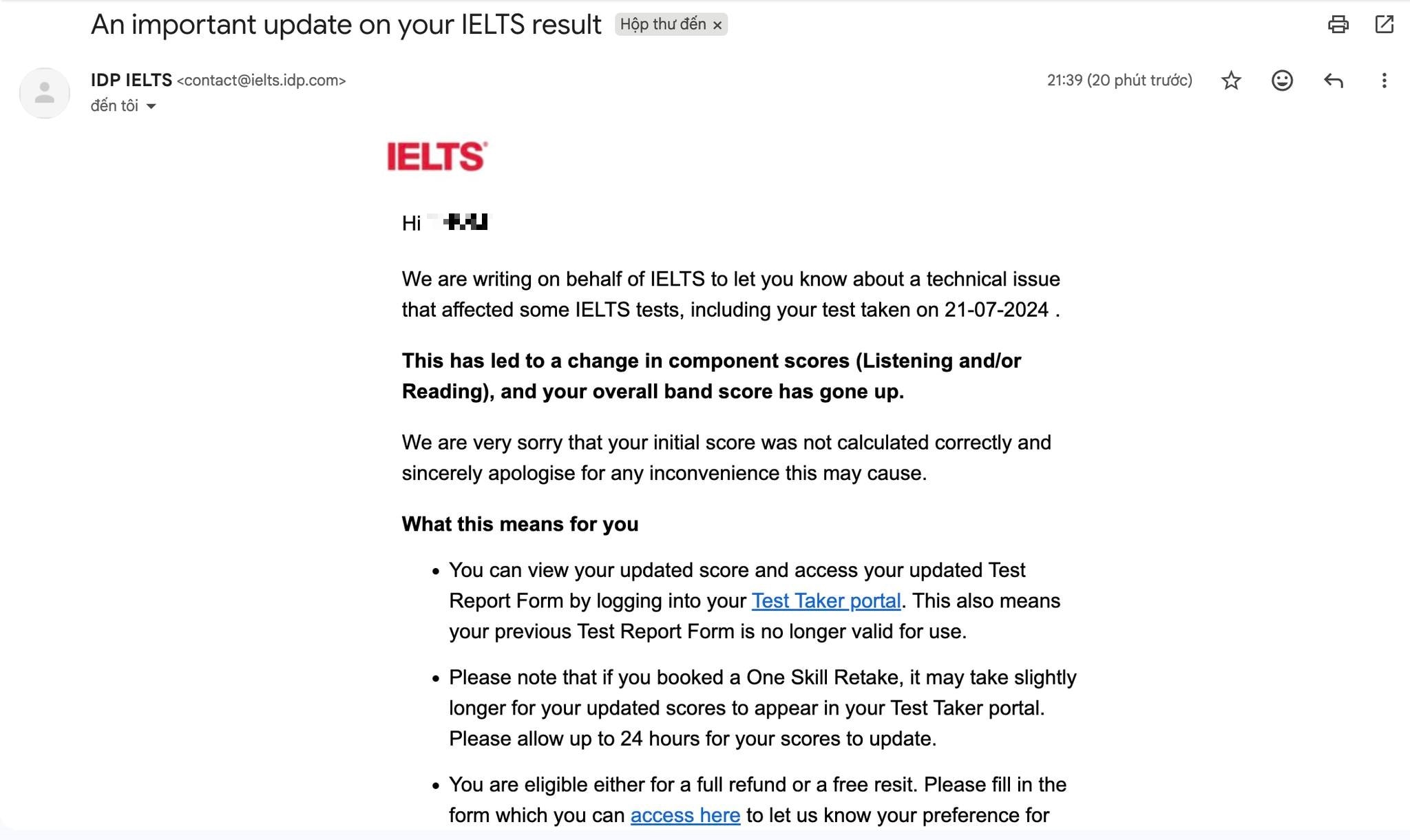 Một học viên thi IELTS năm 2024 cho biết ngày 12/11, em nhận được email thông báo là do lỗi kỹ thuật nên điểm chấm Listening/Reading bị sai. Kết quả Reading của em được sửa từ 7.0 thành 8.0, bảng điểm cũ đã bị vô hiệu và thay bằng bảng điểm mới.