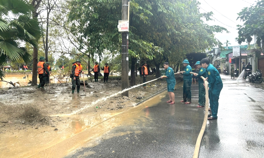 Trong khi đó, lãnh đạo, cán bộ, công chức, viên chức, Người lao động (NLĐ) phường Hóa Châu cùng người dân địa phương, với sự hỗ trợ của 80 chiến sĩ Sư đoàn 968, đã đồng loạt ra quân tổng dọn vệ sinh môi trường sau lũ.