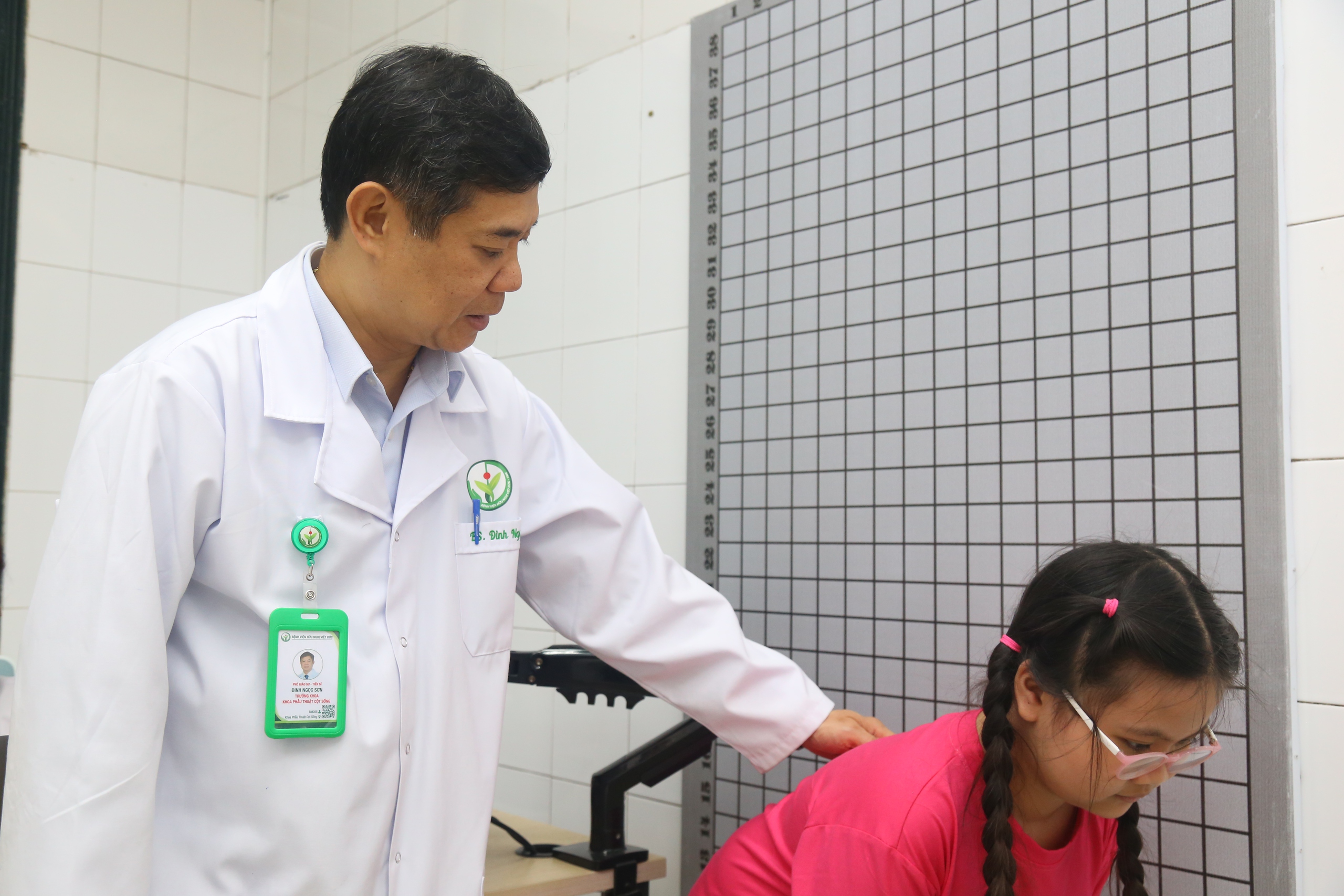 PGS.TS Đinh Ngọc Sơn - Trưởng Khoa Phẫu thuật cột sống, Bệnh viện Hữu nghị Việt Đức thăm khám cho trẻ.