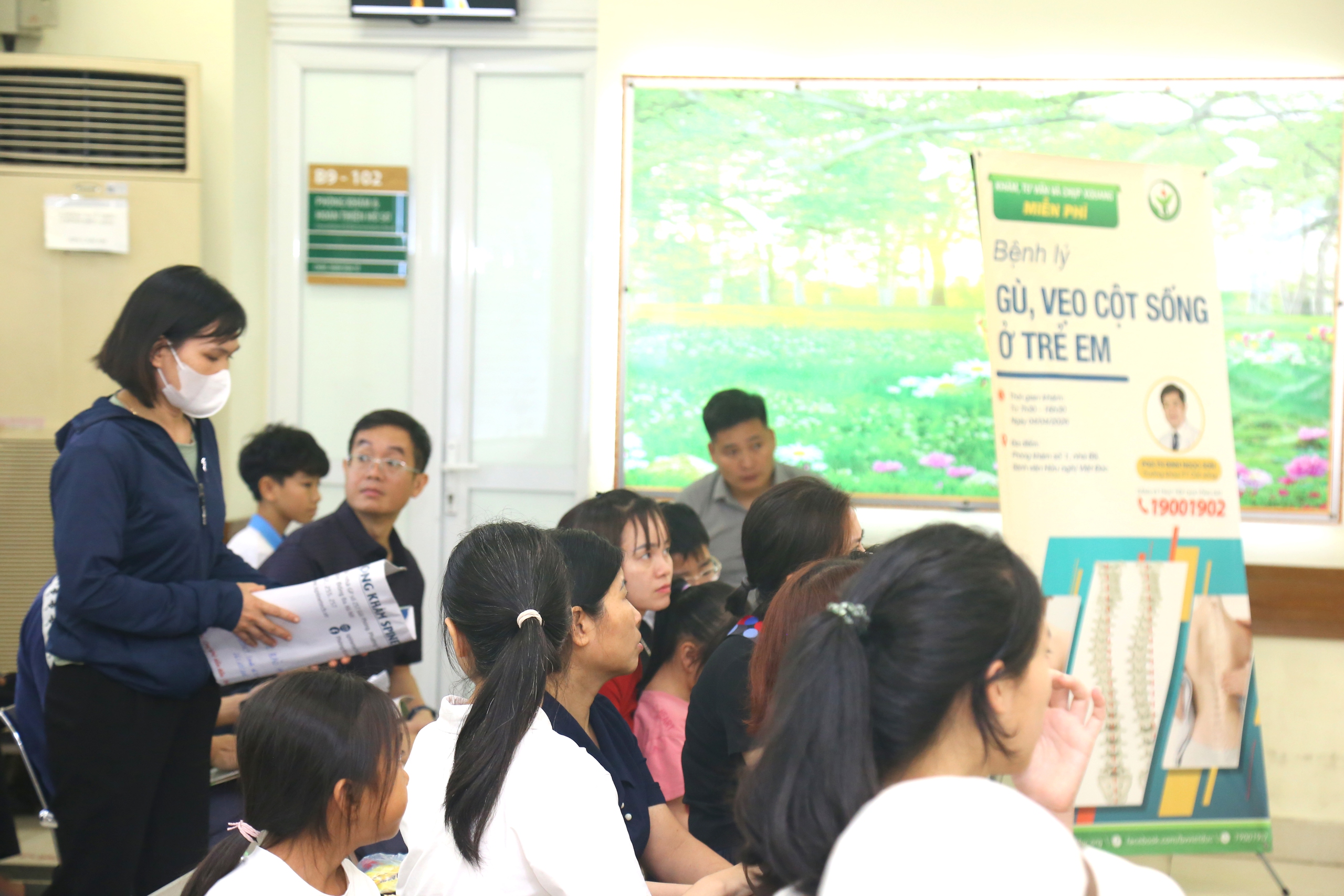 Tại khu vực chờ khám, tư vấn và chụp X-quang miễn phí nhằm sàng lọc và phát hiện sớm các bệnh lý gù, vẹo cột sống ở trẻ em, không chỉ có trẻ ở Hà Nội mà rất nhiều bé ở các tỉnh, thành lân cận.