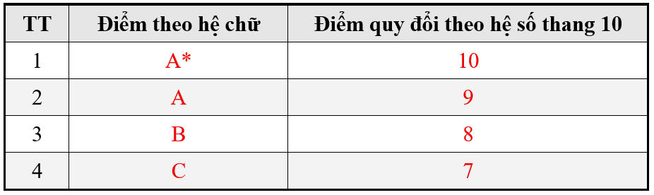 Đối với các chứng chỉ quốc tế có điểm thành phần môn học đánh giá theo hệ chữ, bảng quy đổi sang điểm số như sau: