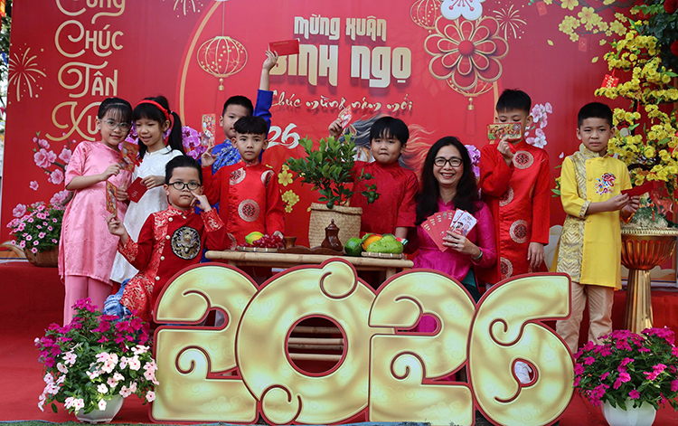 Theo ghi nhận của phóng viên Báo Tin tức và Dân tộc, nhiều trường học đã chủ động trang trí khuôn viên lớp học, sân trường với sắc đỏ, vàng đặc trưng của ngày Tết; dựng tiểu cảnh Tết xưa, câu đối đỏ, bánh chưng, bánh tét, hoa mai, hoa đào… tái hiện không gian Tết cổ truyền, giúp học sinh có cơ hội tìm hiểu và cảm nhận rõ hơn nét đẹp văn hóa dân tộc.