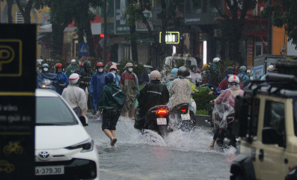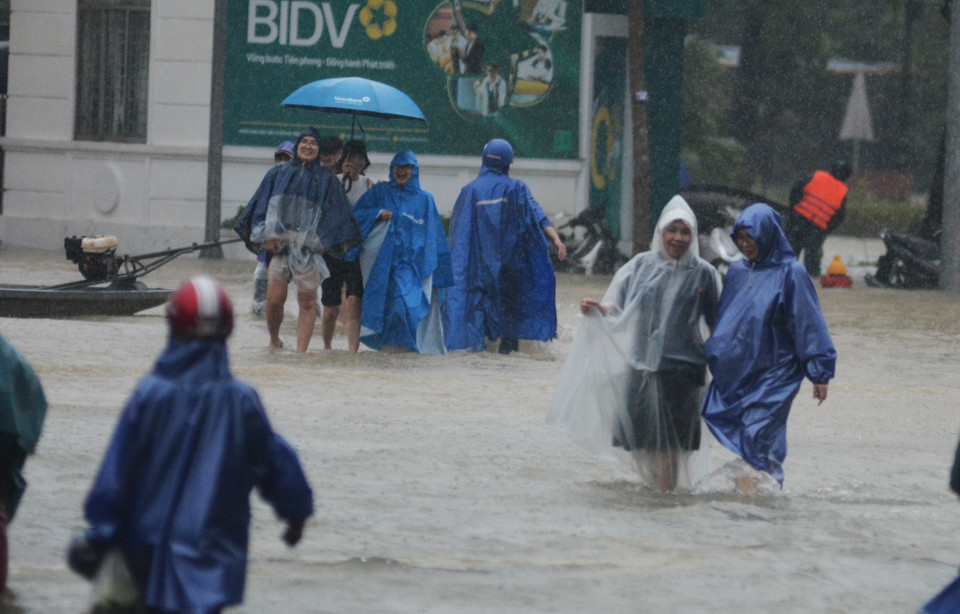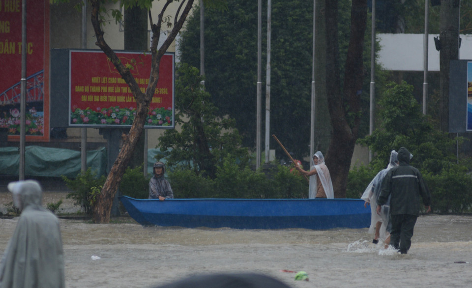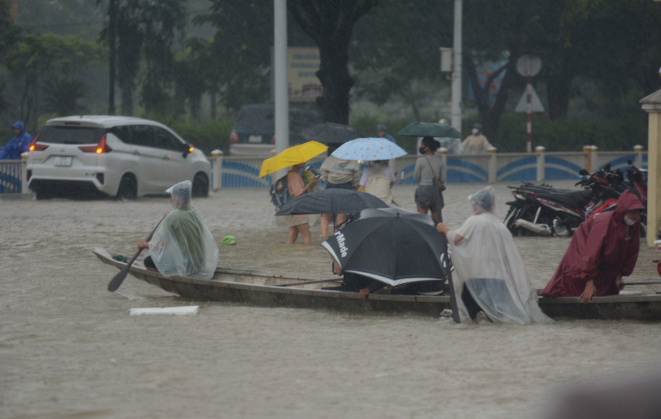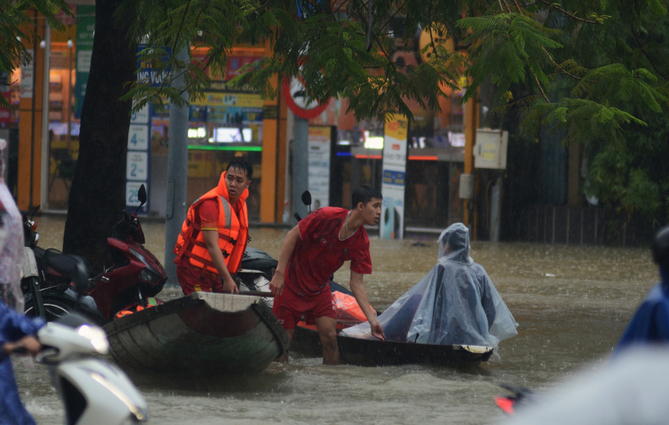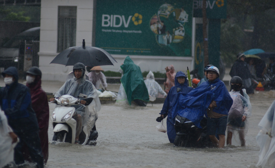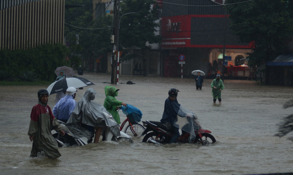 Ngã 6 giao nơi giữa các trục đường chính như Hùng Vương, Lê Quý Đôn, Bến Nghé, Hà Nội bị ngập nặng, nơi ngập sâu lên đến 0,5-0,6m. (Ảnh: Văn Dũng/TTXVN)