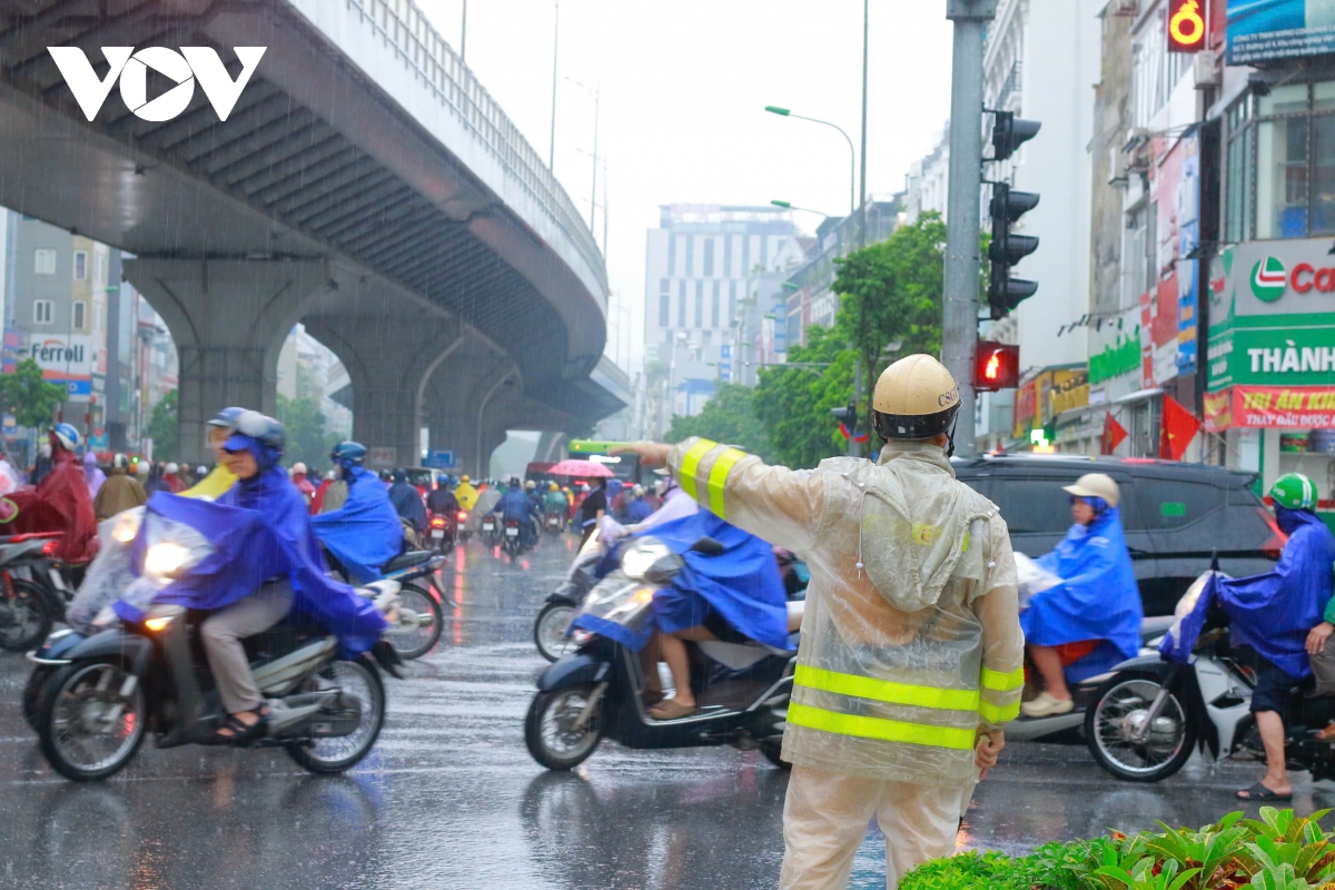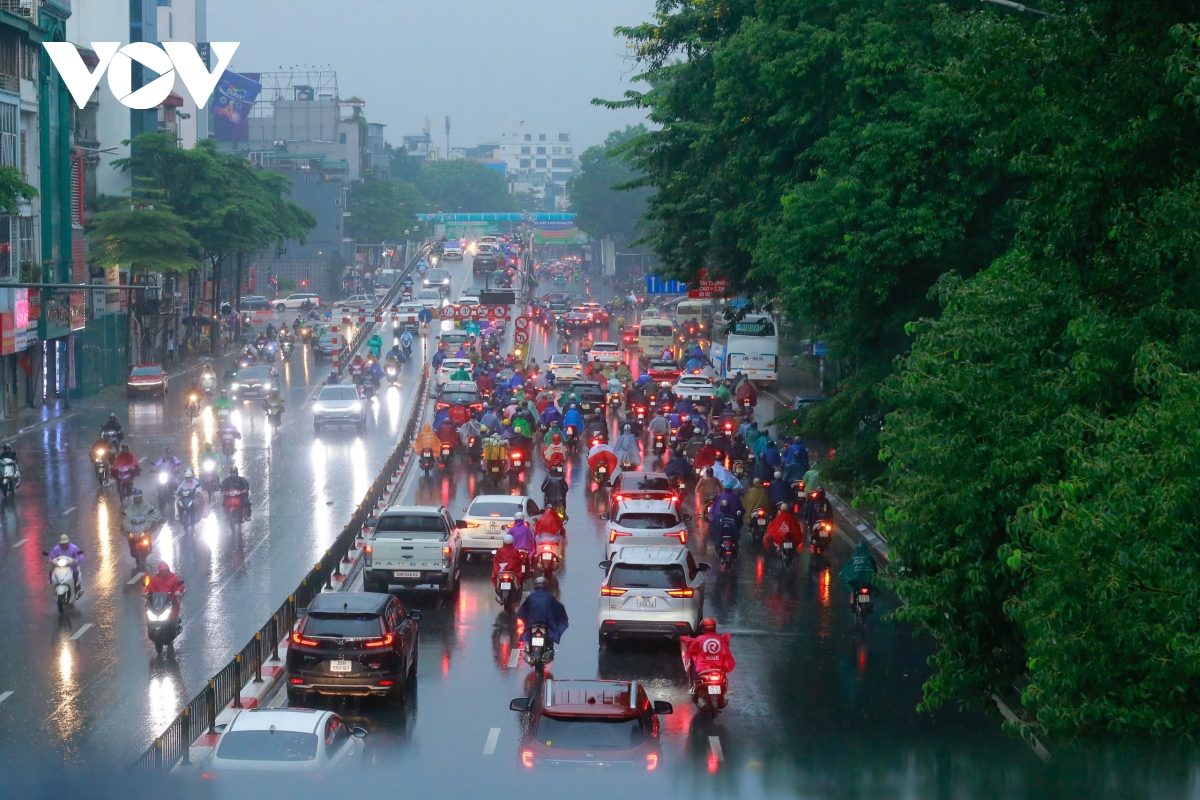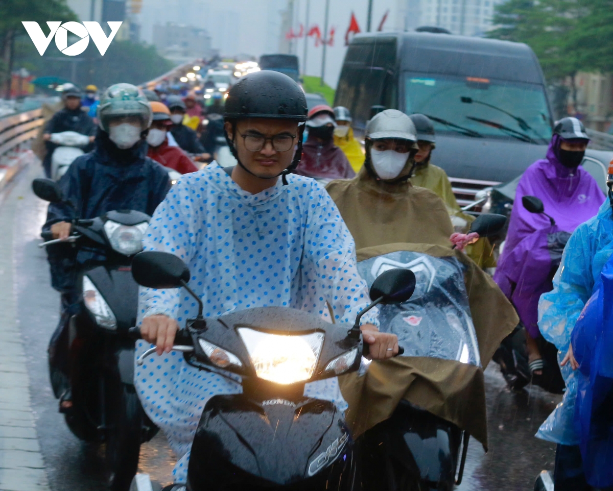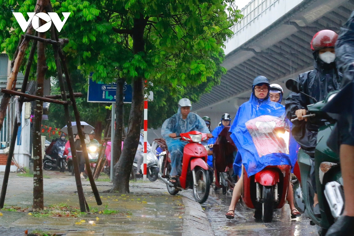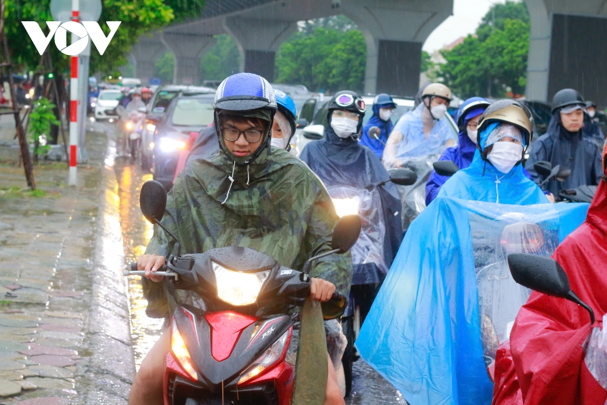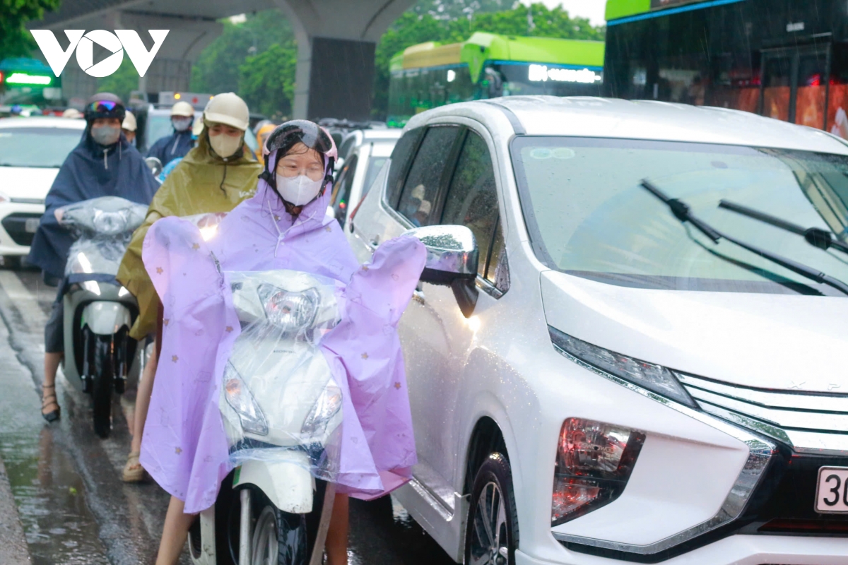 Chị Nguyễn Thị Hoa, phường Thanh Xuân, Hà Nội chia sẻ: "Do trời mưa đúng giờ cao điểm nên di chuyển khó khăn. Cứ mỗi khi có mưa giờ cao điểm thế này, tôi sẽ mất gấp 2-3 lần thời gian để đi từ nhà đến chỗ làm. Xe ô tô thì đi chen toàn bộ lòng đường. Xe máy chỉ có thể len 1 lượt để tranh thủ vượt qua, nếu không thì phải đi lên vỉa hè".