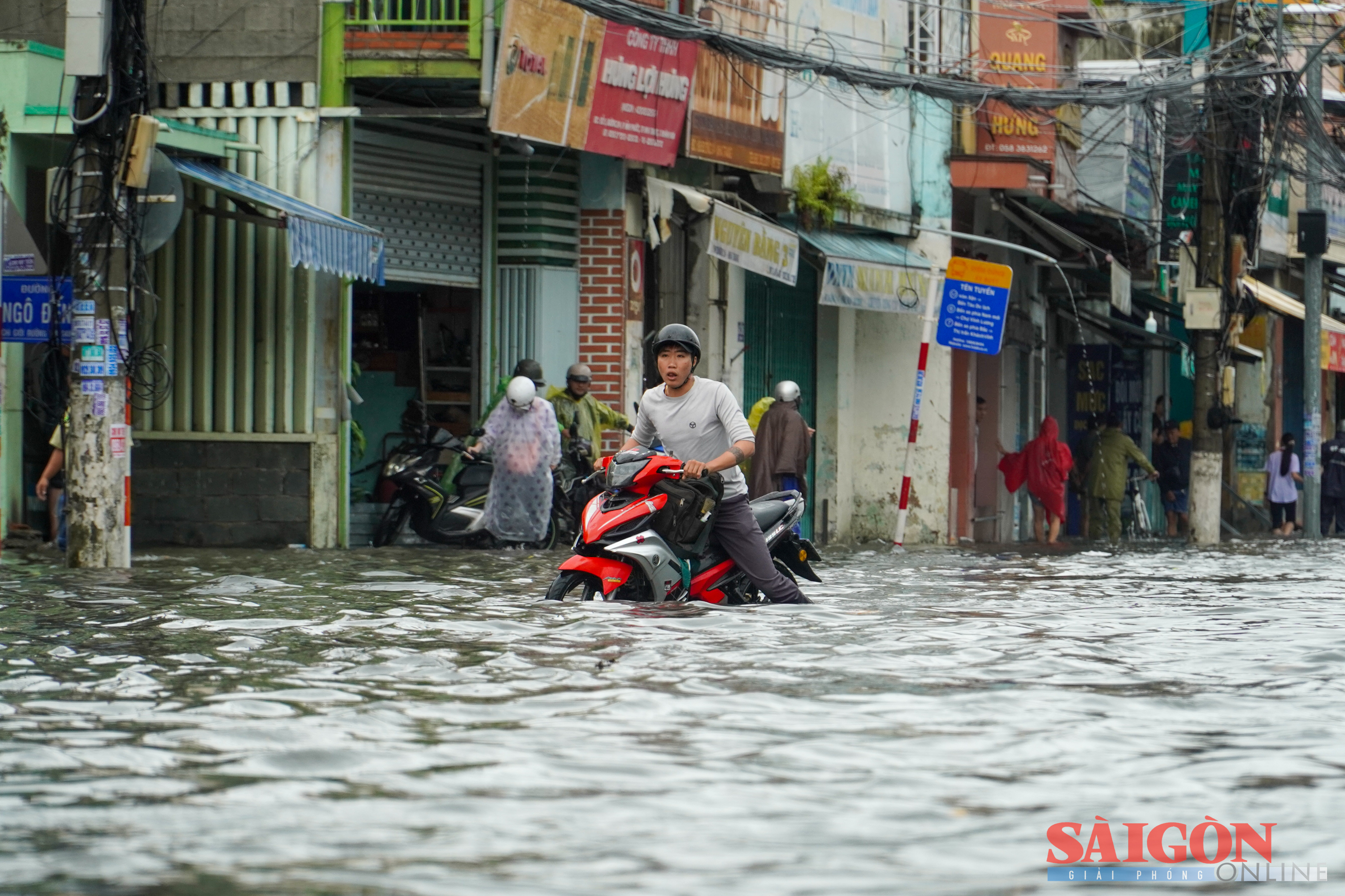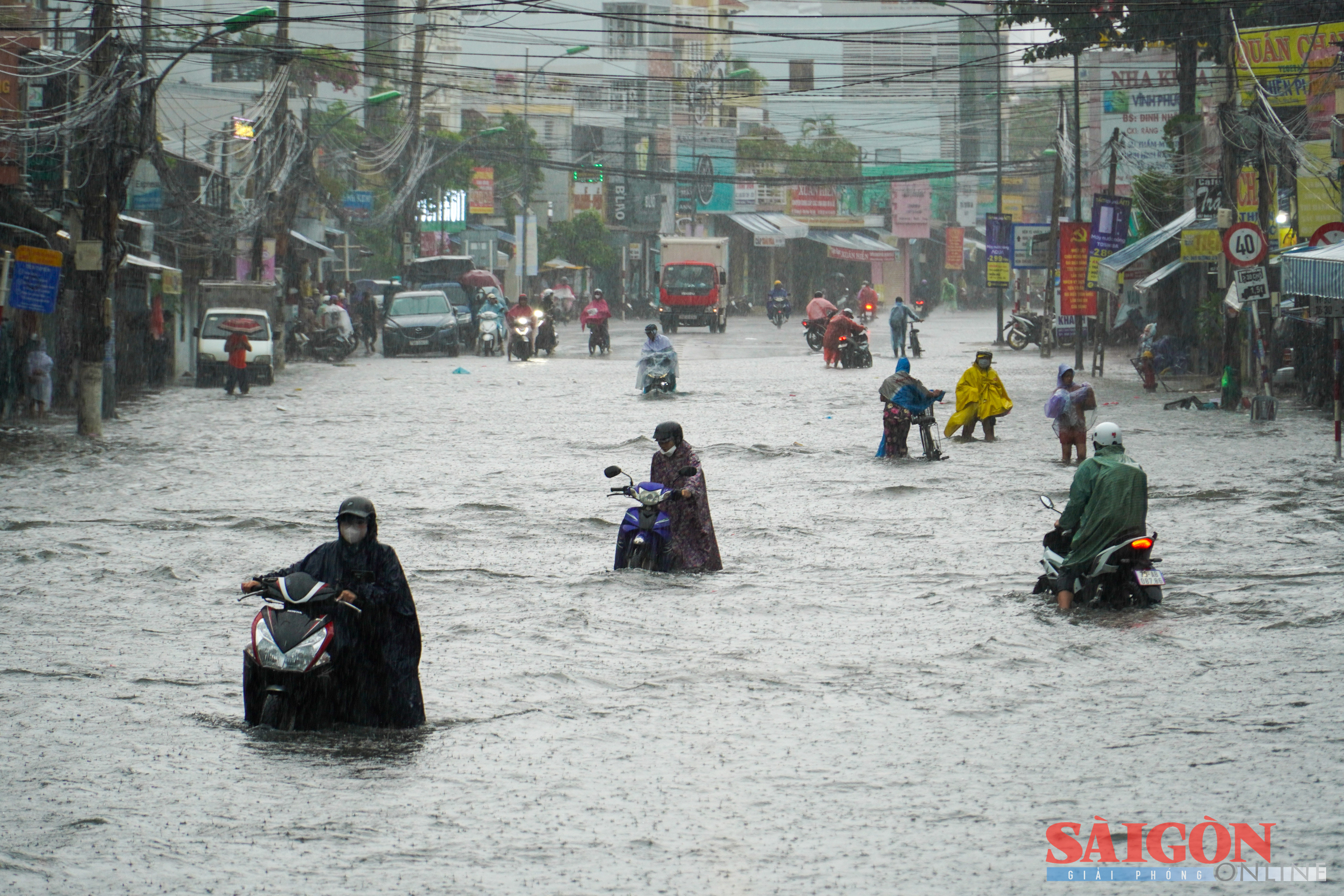Nhiều tuyến đường bị ngập cục bộ trong mưa lớn, sáng 16-10. Thực hiện: HIẾU GIANG