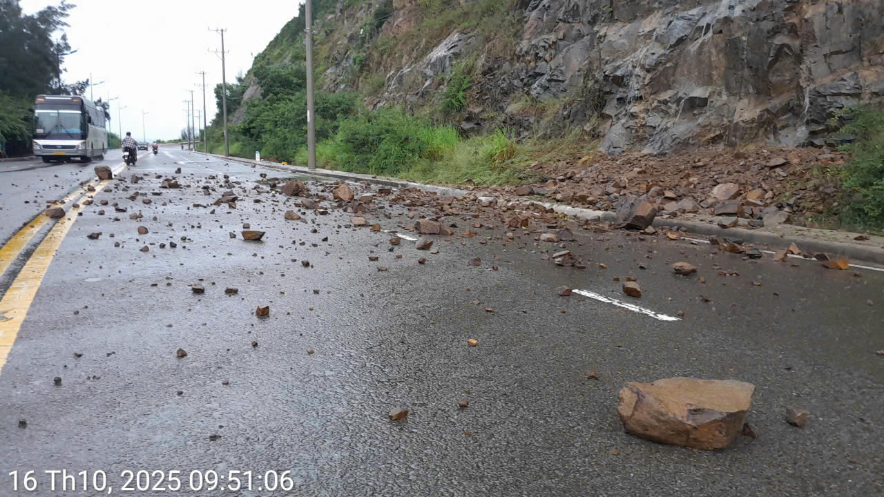 Sạt lở đá xuống đường Phạm Văn Đồng (khu vực đèo Lương Sơn, phường Bắc Nha Trang) sau mưa lớn. Ảnh: SXD