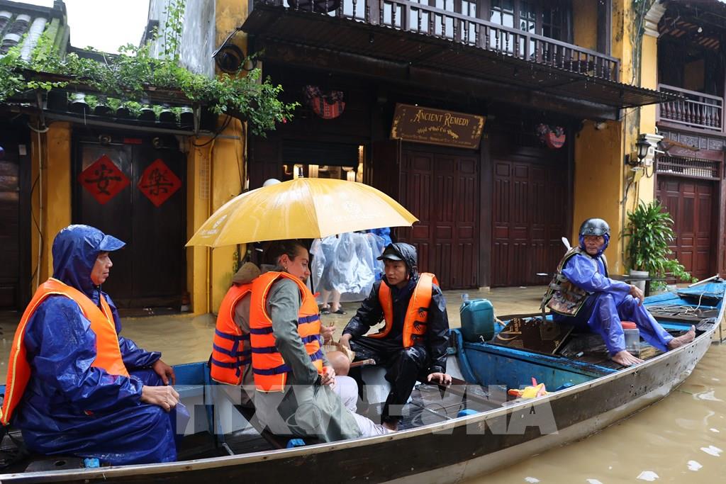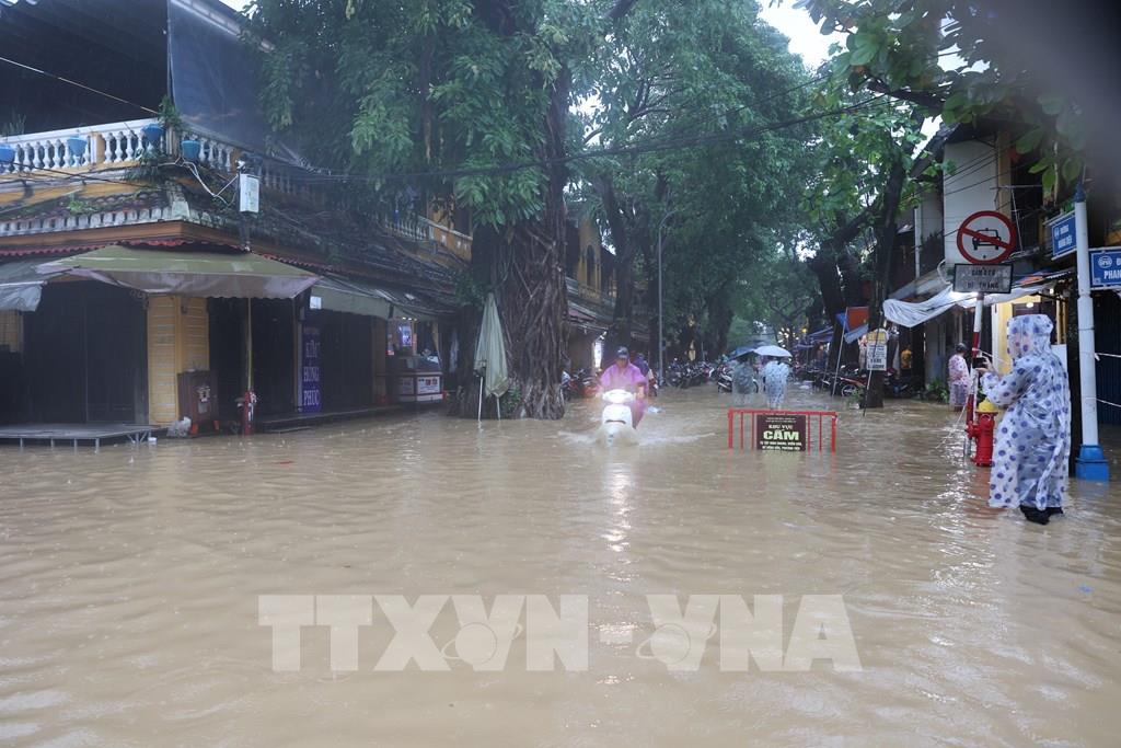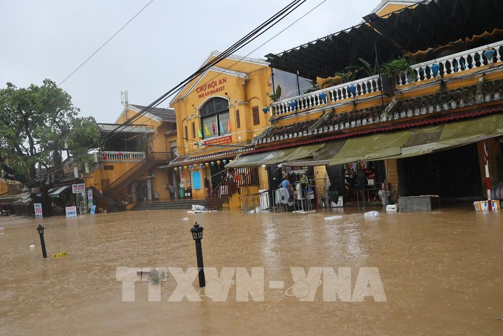Nước ngập sâu tại nhiều tuyến phố thuộc khu vực chợ Hội An. Ảnh: Anh Dũng – TTXVN
