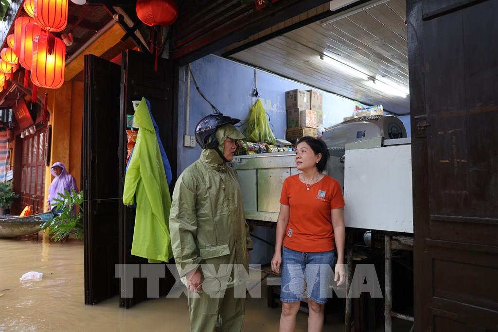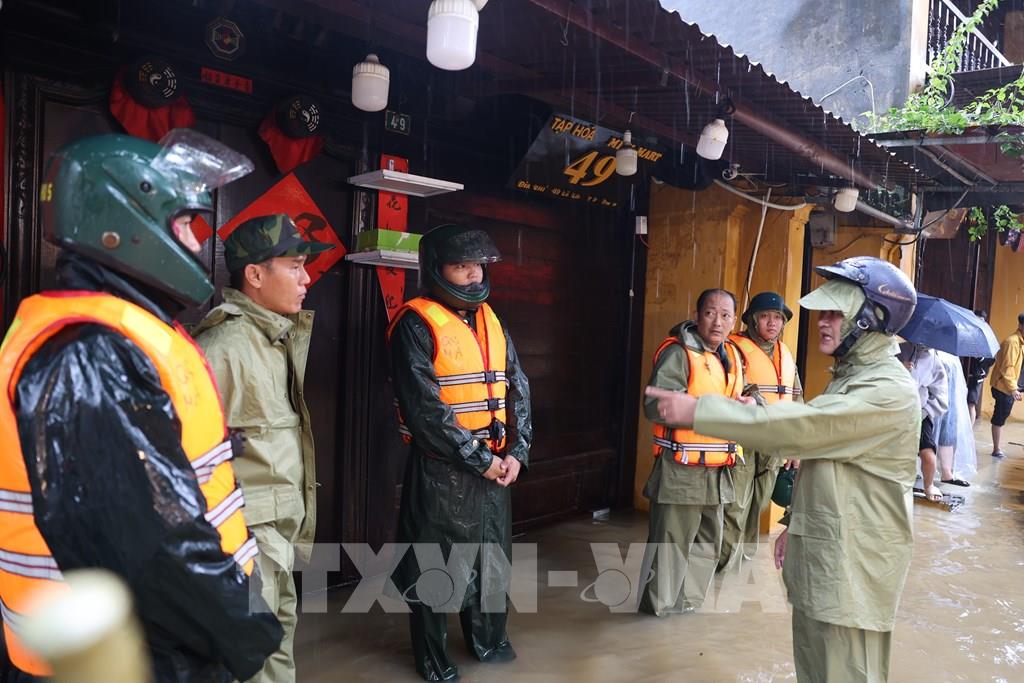 Chủ tịch phường Hội An Nguyễn Tấn Cường (ngoài cùng bên phải) chỉ đạo lượng chức năng tăng cường ứng trực ở các vị trí xung yếu để hỗ trợ nhân dân. Ảnh: Anh Dũng – TTXVN