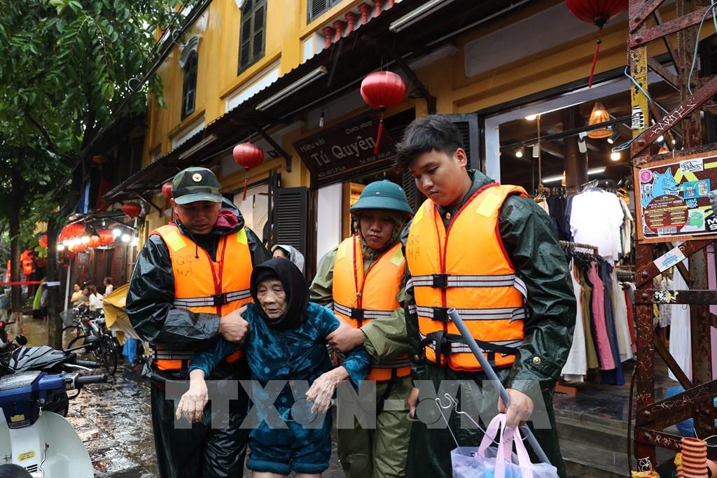 Lực lượng chức năng hỗ trợ người dân di chuyển đến nơi an toàn. Ảnh: Anh Dũng - TTXVN