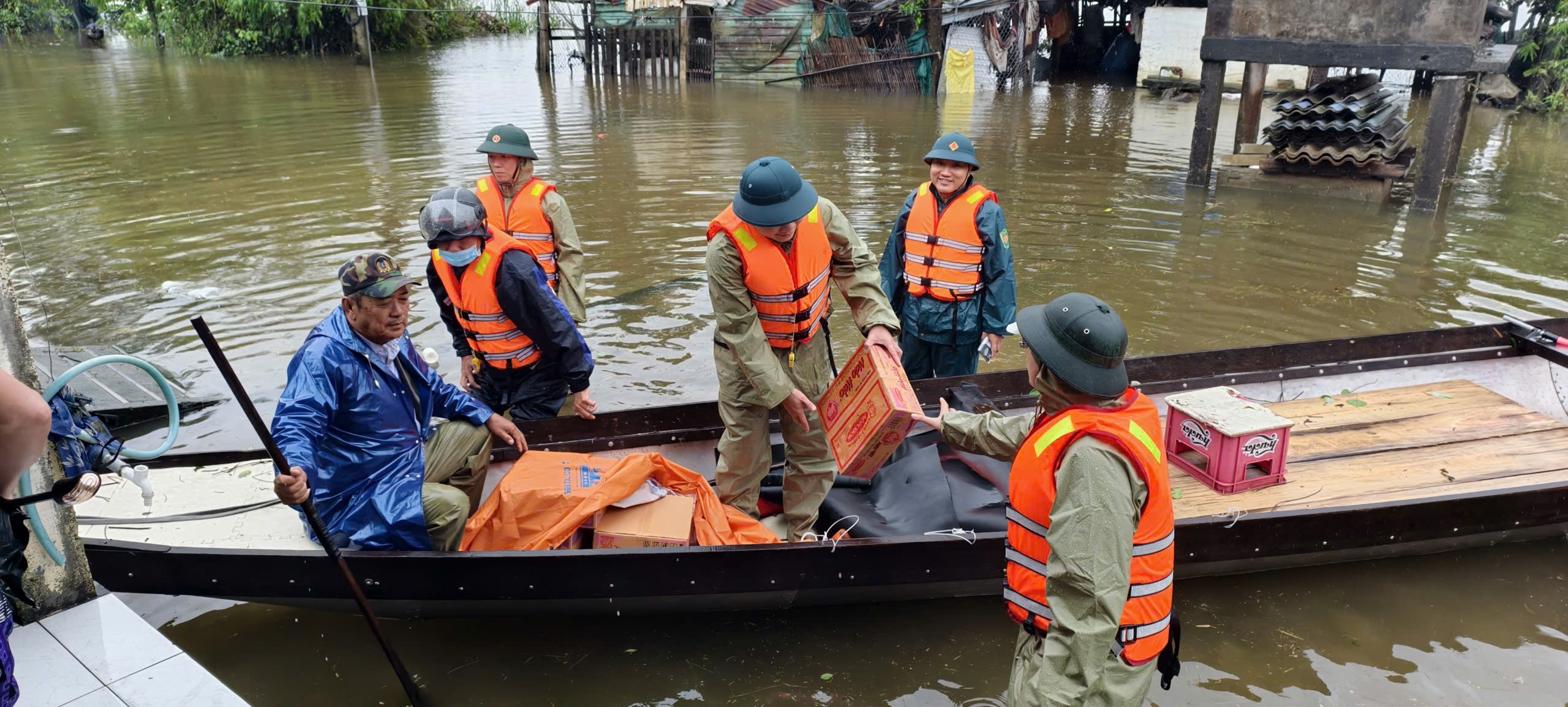 Lãnh đạo UBND phường Hóa Châu hỗ trợ mì tôm cho người dân vùng ngập lụt