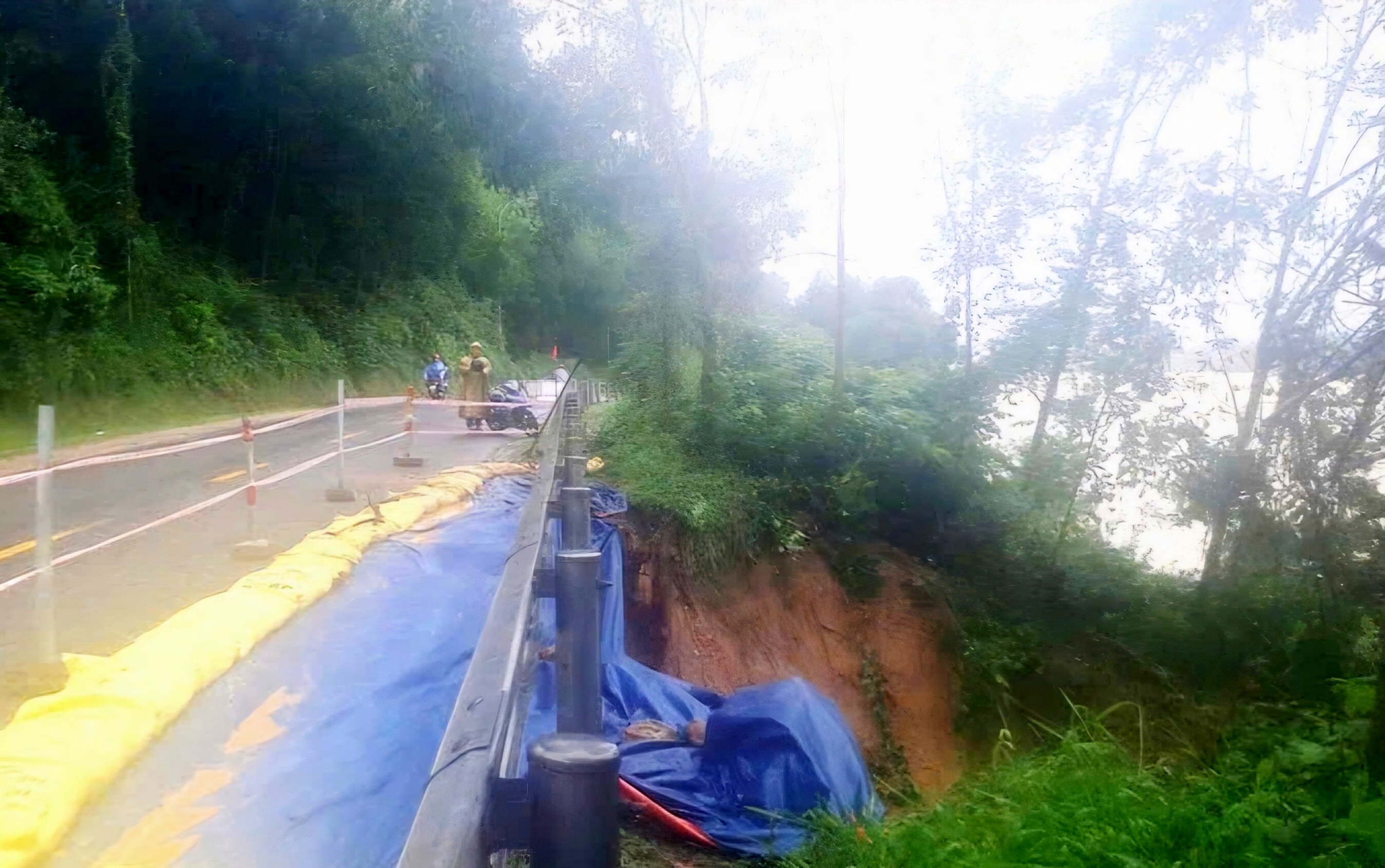 Lực lượng chức năng sử đất đá và bạt để khắc phục tạm thời vị trí sạt lở trên quốc lộ 49