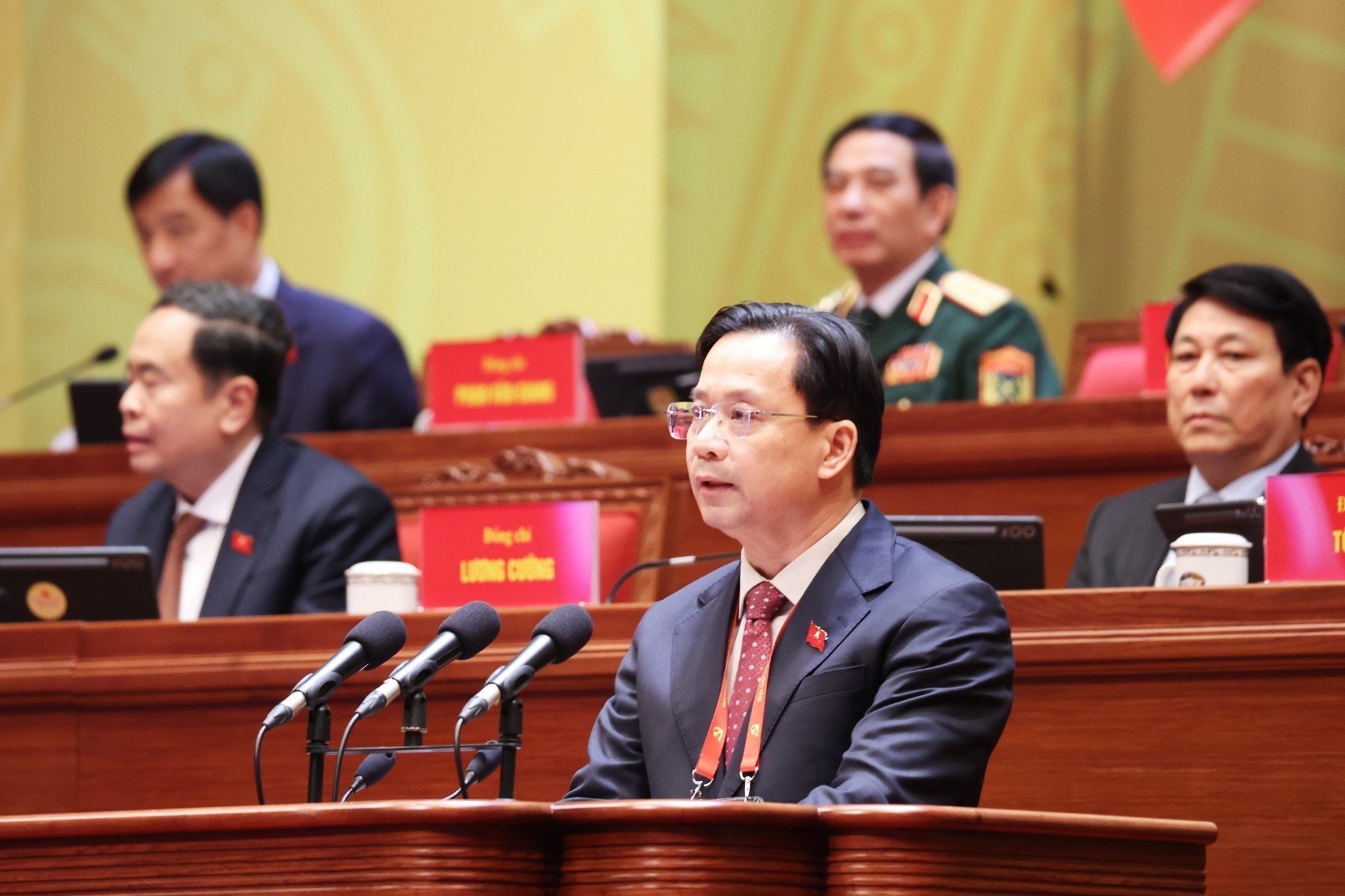 Đồng chí Bùi Quang Huy, Ủy viên dự khuyết Trung ương Đảng, Phó Chủ tịch Ủy ban Trung ương Mặt trận Tổ quốc Việt Nam, Bí thư thứ nhất Ban Chấp hành Trung ương Đoàn trình bày tham luận với chủ đề “Tăng cường giáo dục lý tưởng cách mạng, đạo đức, lối sống văn hóa, bồi dưỡng thanh niên trở thành lực lượng kế cận xuất sắc của Đảng” - Ảnh: Báo Nhân dân.