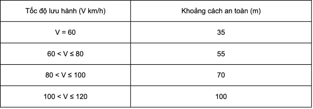 Trong điều kiện đường khô ráo, bằng phẳng, tầm nhìn tốt, khoảng cách an toàn tương ứng với mỗi tốc độ được quy định: Tốc độ 60 km/h cách 35 m; trên 80 km/h cách 55 m; trên 100 km/h cách 70 m; trên 120 km/h cách 100 m.