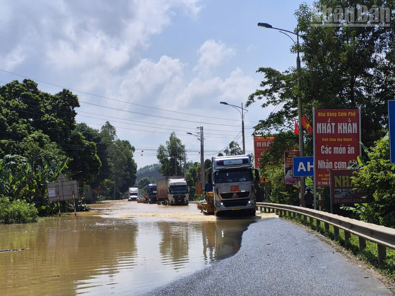 Ghi nhận vào sáng 9/10, tuyến Quốc lộ 1A, tuyến giao thông huyết mạch qua địa bàn tỉnh Lạng Sơn, hiện vẫn còn nhiều điểm đang ngập sâu, khiến việc di chuyển của các phương tiện gặp rất nhiều khó khăn.