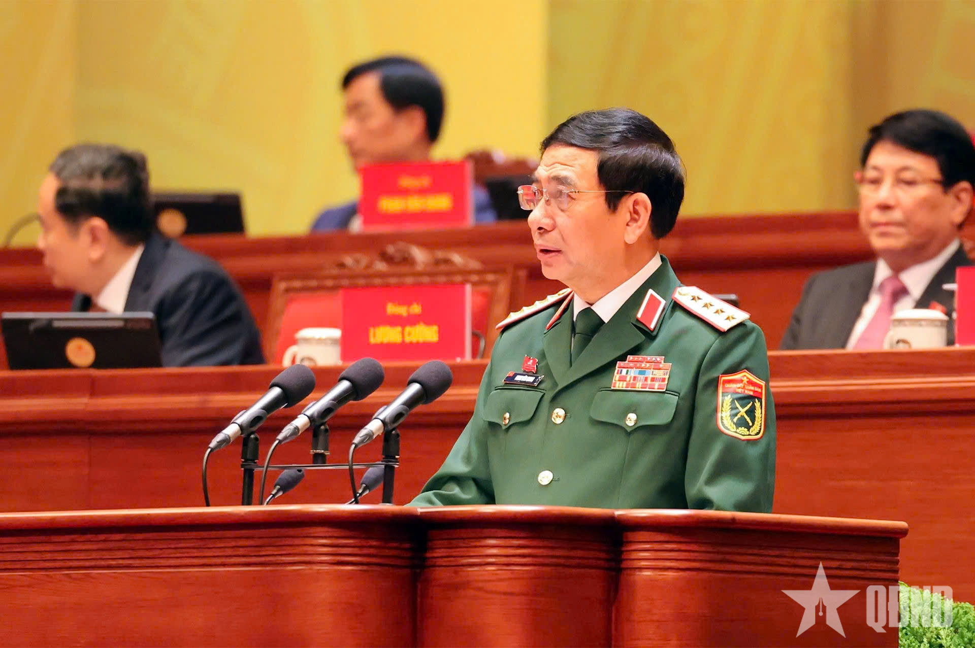 Đại tướng Phan Văn Giang, Ủy viên Bộ Chính trị, Phó bí thư Quân ủy Trung ương, Bộ trưởng Bộ Quốc phòng phát biểu tham luận tại Đại hội.
