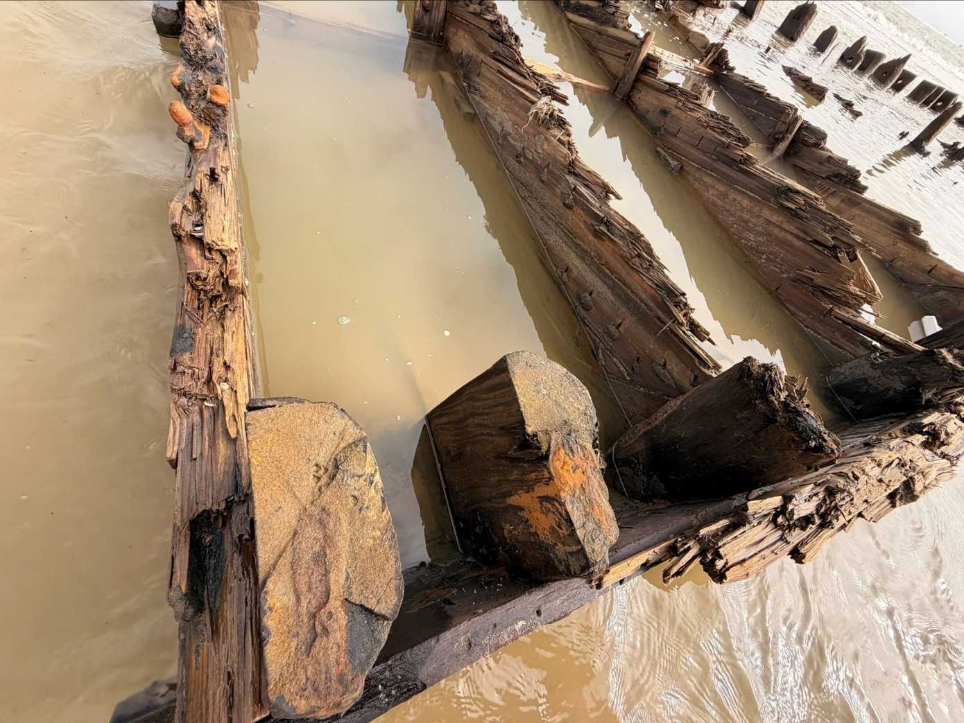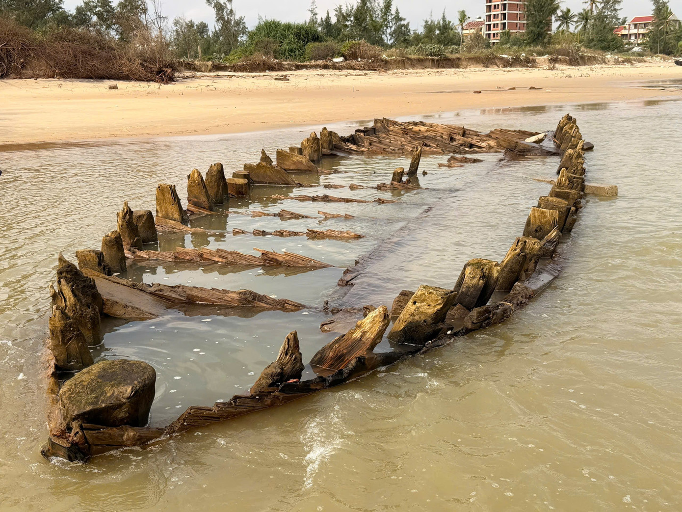 Sau mưa lũ, chiếc tàu cổ ở bờ biển Hội An trồi lên hiện rõ rệt hình hài.
