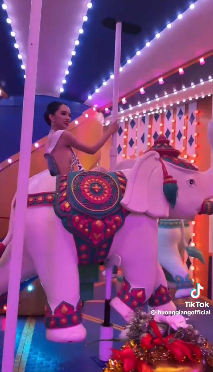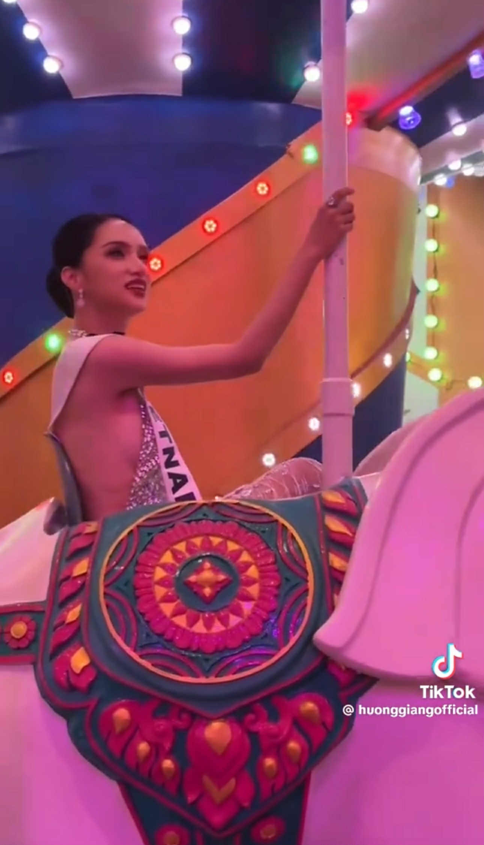 Mới đây, Hương Giang khiến mạng xã hội "dậy sóng" khi đăng tải đoạn clip ngắn trên tài khoản TikTok cá nhân. Trong video, nàng hậu đeo sash "VIETNAM", diện trang phục lấp lánh và vui vẻ ngồi trên vòng xoay ngựa gỗ trong khu vui chơi giải trí. Đi kèm clip, cô viết dòng chú thích dí dỏm: "Chưa muốn về đâu, có thể là ở lại đây chơi tới sáng".
