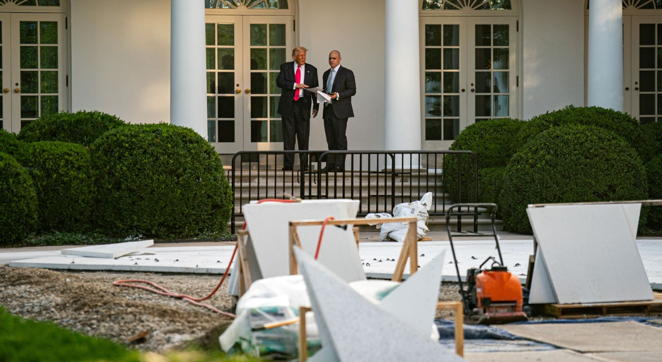 Tổng thống Trump (trái) và ông James Blair, Phó chánh văn phòng Nhà Trắng xem quá trình cải tạo Vườn Hồng của Nhà Trắng ở Washington, D.C., vào ngày 15/7. Ảnh: Getty Images
