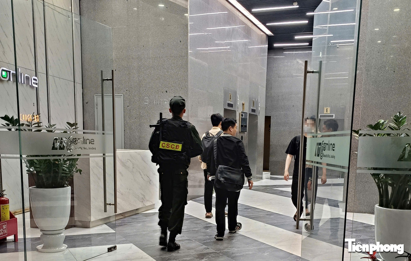Cảnh sát có mặt tại tòa nhà, nơi đặt trụ sở công ty của Shark Bình. Ảnh: Thanh Phong