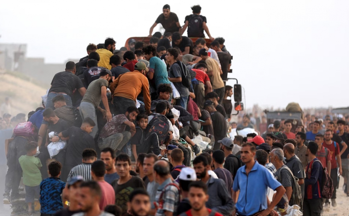 Người dân Gaza lũ lượt trèo lên xe cứu trợ để tranh giành hàng tiếp tế. Ảnh: Reuters