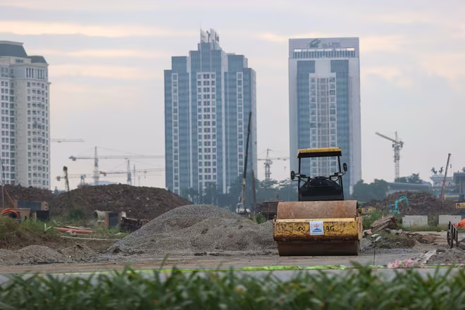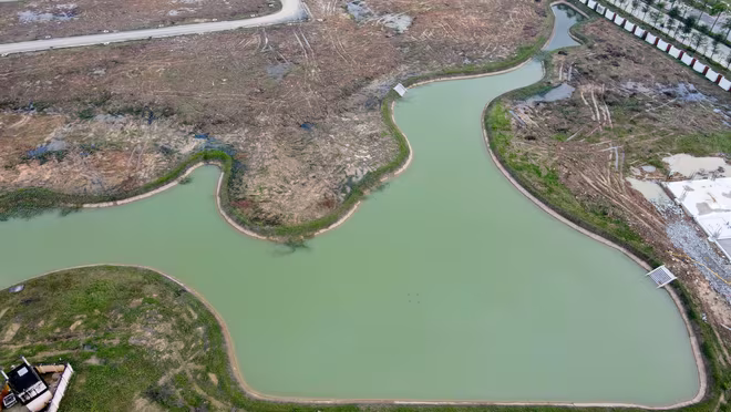 Trên công trường, các khu đất đang được san nền, bóc tách và tạo hình mặt bằng, chuẩn bị cho hệ thống đường nội bộ và các tiện ích mặt nước.